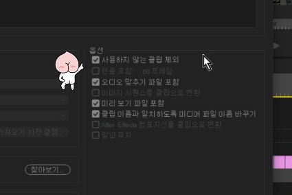 이렇게 사용하지않는 것들을 제외하고 한 폴더에 사용한 영상과 이미지를 모아 놓으면, 프로젝트가 빨라지기도 합니다.