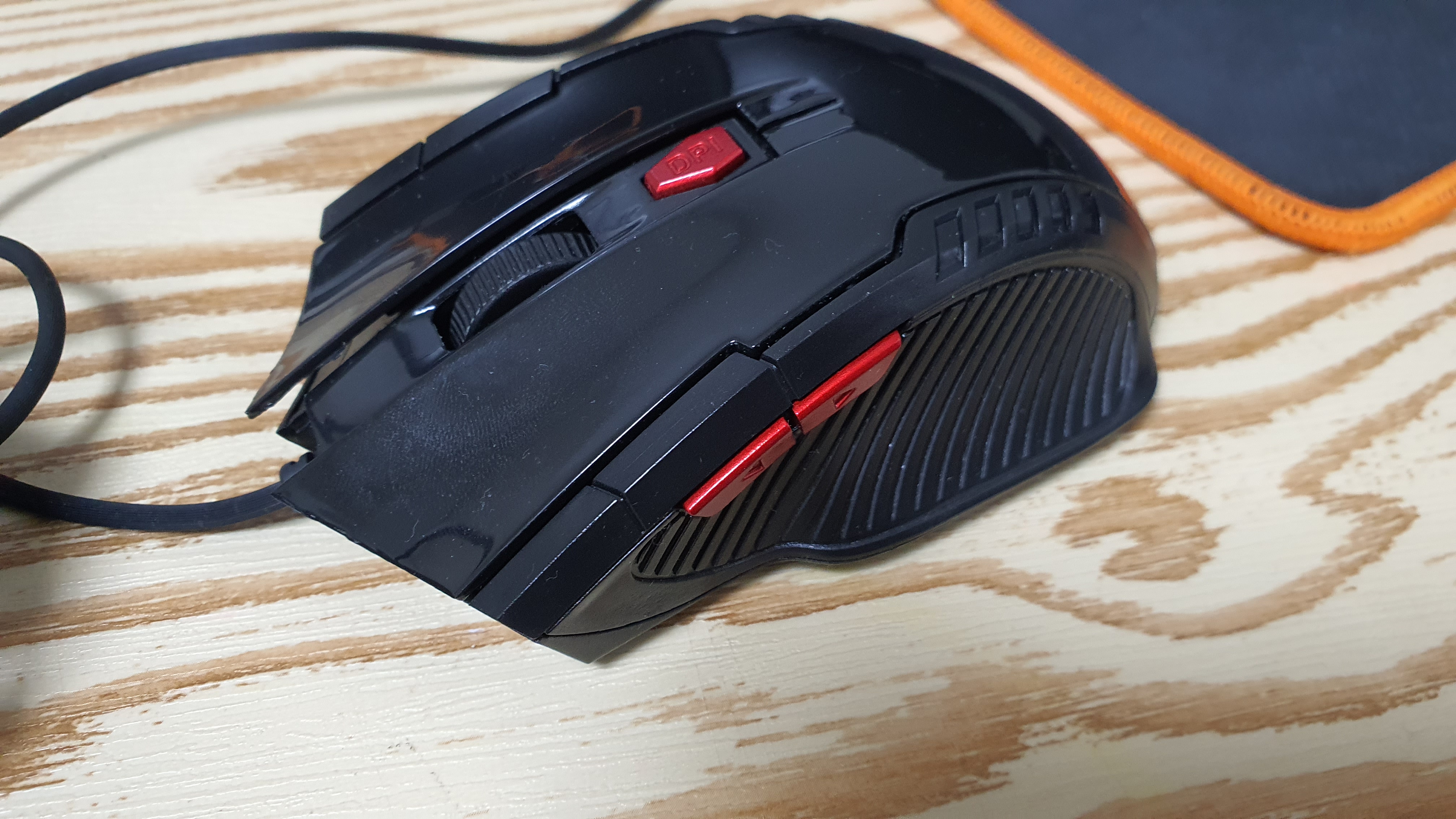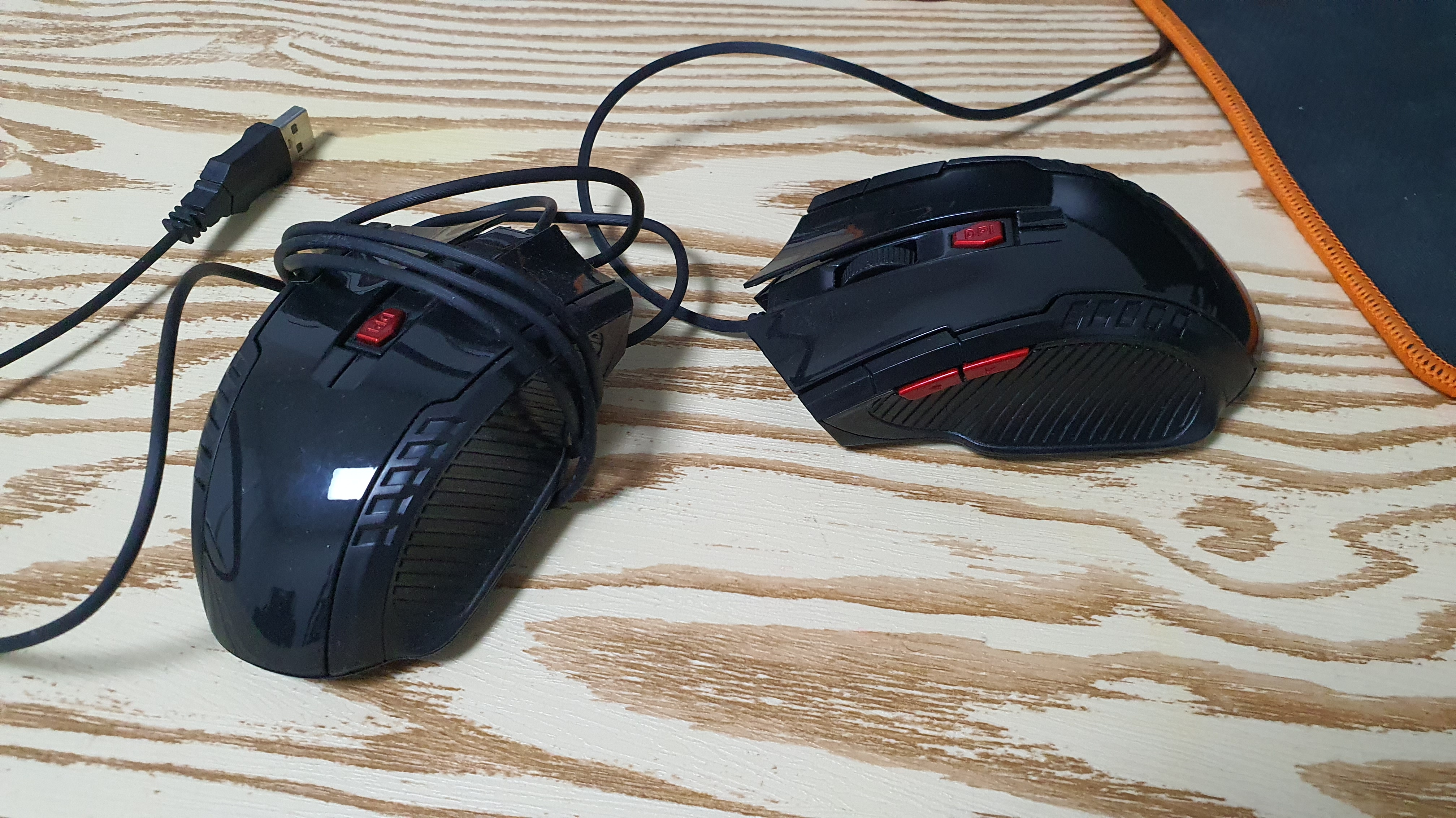올해 하반기에 구매한 다이소 게이밍 마우스 두 개, 하나는 옆 앞으로 뒤로 버튼 고장, 다른 하나는 휠 고장입니다.