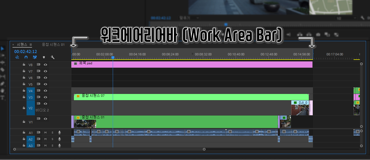 워크 에어리어 바 (Work Area Bar / 작업 영역 바)는 영상을 '출력할 때(내보내기)', '적용한 효과를 확인할 때(렌더링)' 사용합니다.