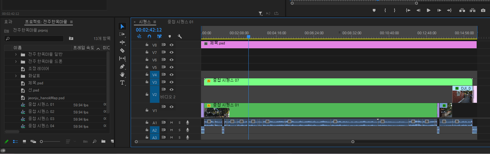 그래서 시퀀스를 나눠서 5~25분 단위로 장면을 나눠서 편집을 하고, 나중에 하나의 시퀀스에서 종합하여 출력하는 것이 렉도 줄이고 컴퓨터에 부담을 줄이는 방법입니다.