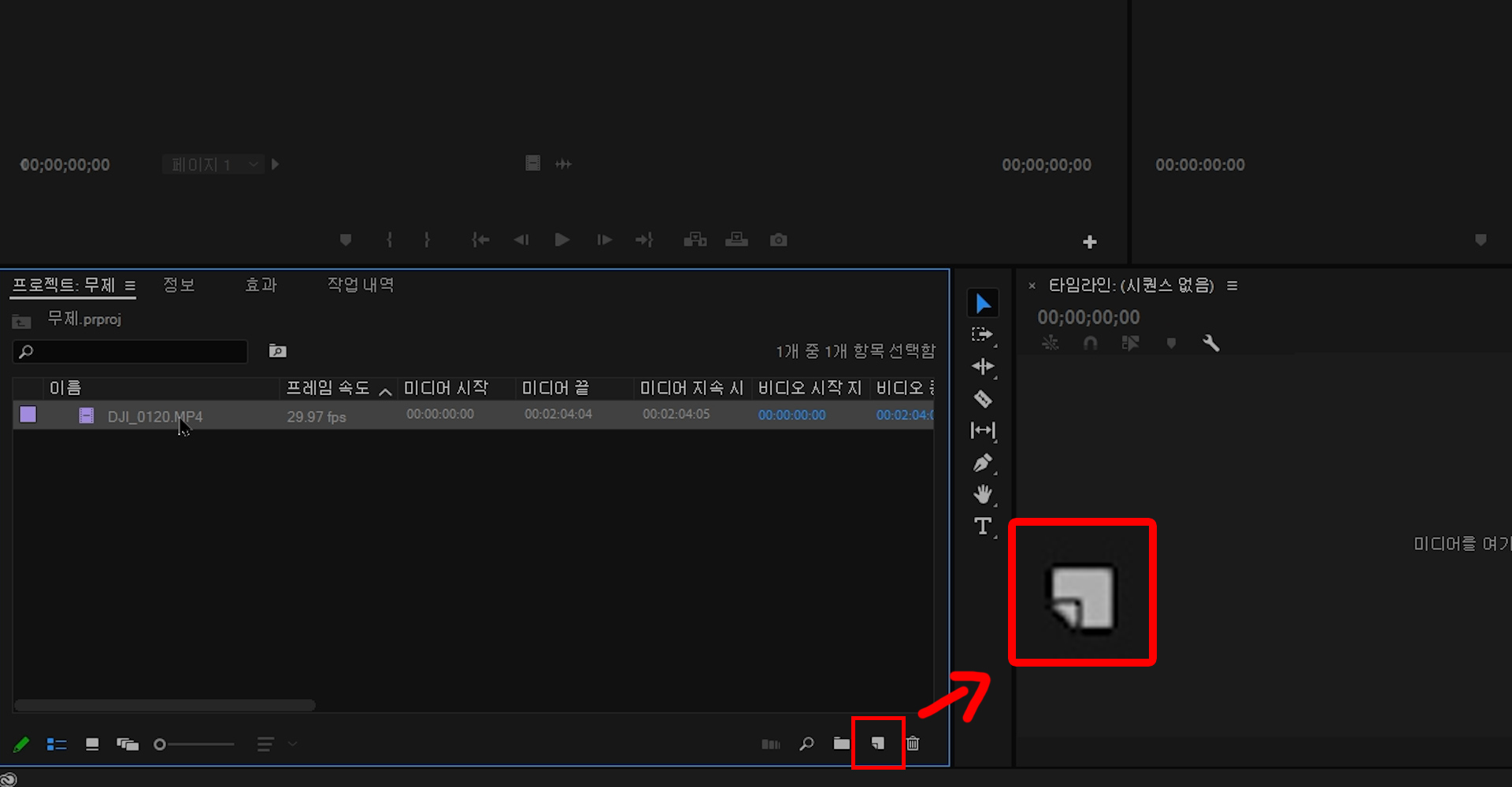 영상에 맞는 시퀀스를 만드는 다른 방법으로는 영상을 잡고 끌어서 '새 항목(접힌 네모 쪽지 모양)'으로 가져다 놓으면 됩니다.