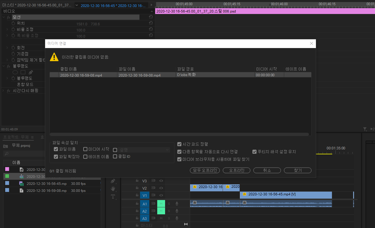그래서 프리미어에 불러온 영상(이미지 등 미디어)이 '지워졌던가 혹은 다른 곳으로 옮겨졌다면', '미디어 연결' 창이 뜹니다.