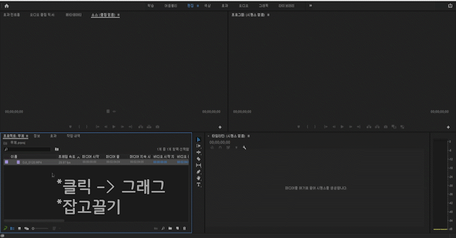 타임라인에 아무것도 없다면 '미디어를 여기로 끌어 시퀀스를 생성합니다.'라고 쓰여 있습니다.