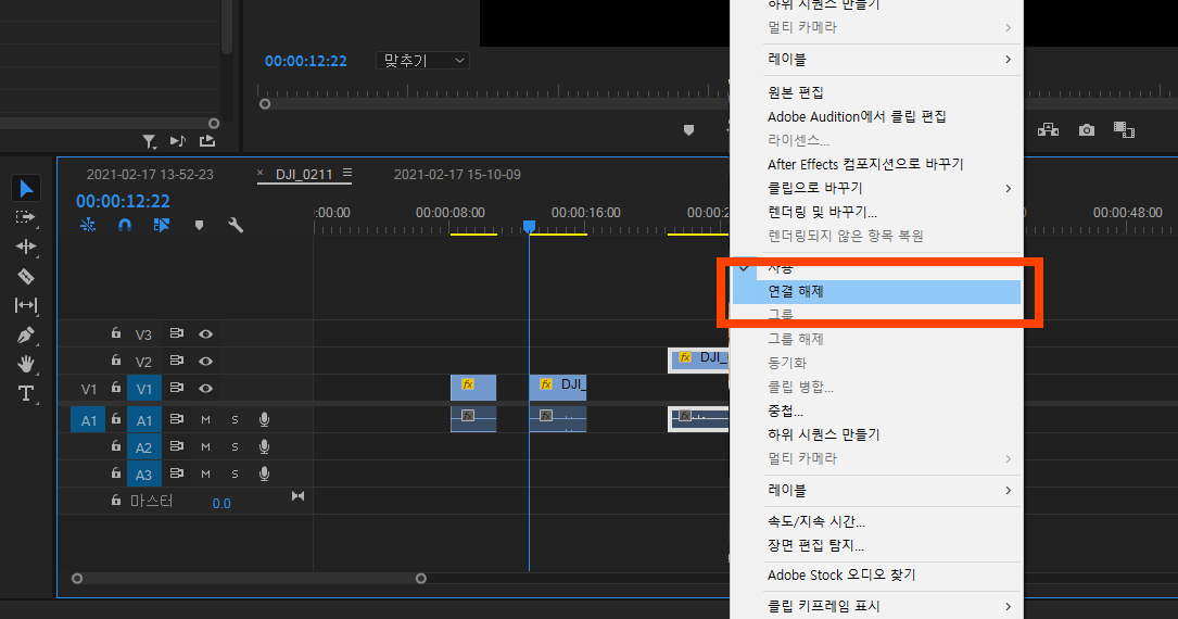 타임라인에 클립에 마우스 우클릭하여 '연결 해제/연결' 하는 것과 같은 기능입니다.