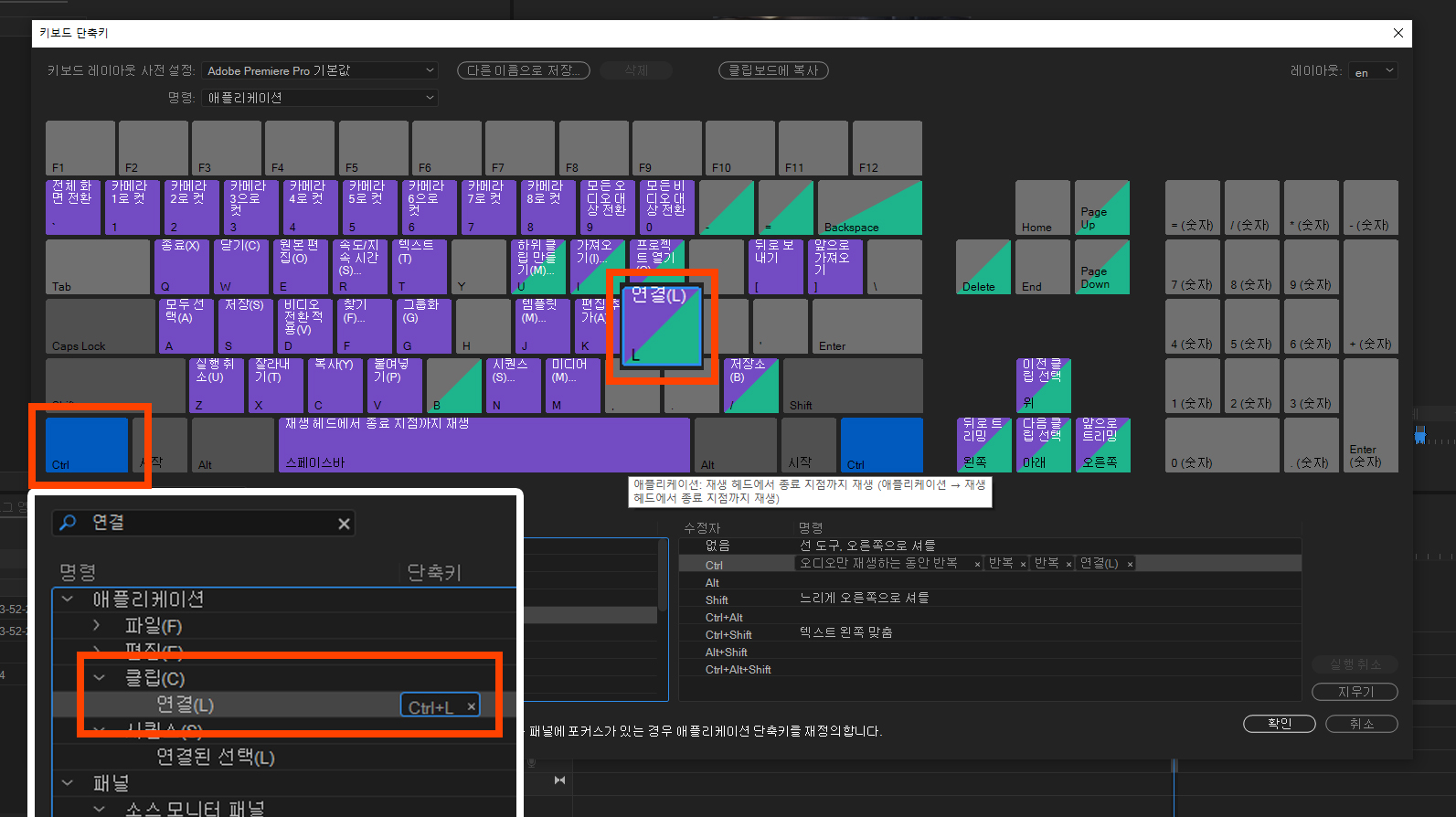 원래 어도비 프리미어에서 '연결' 단축키는 'ctrl + L'입니다.