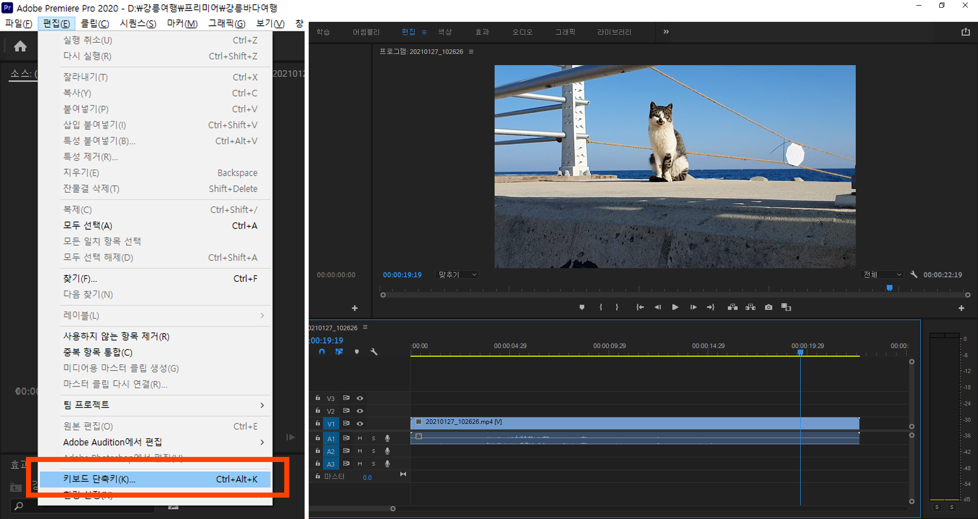 어도비 프리미어 단축키 환경설정 위치.