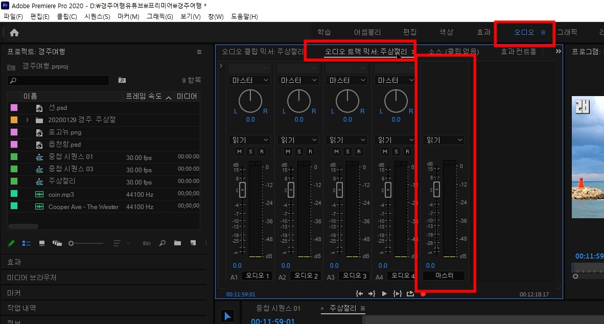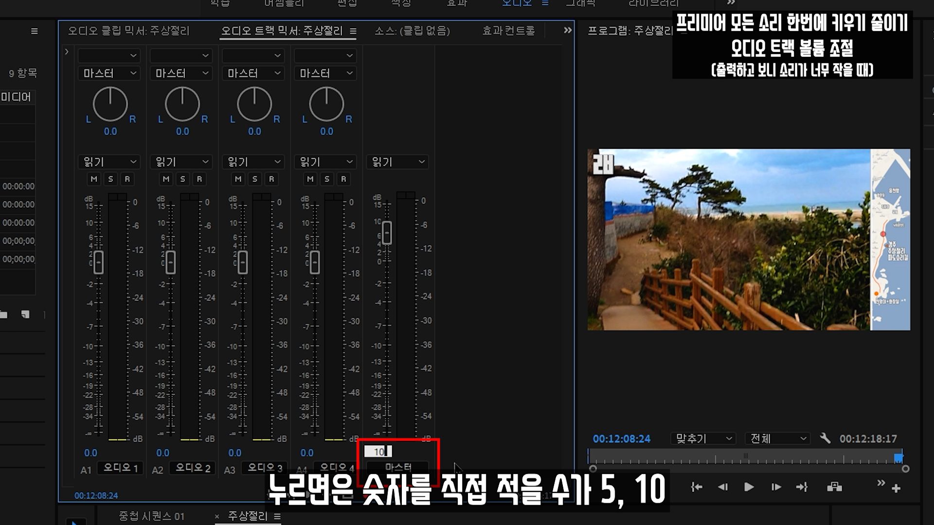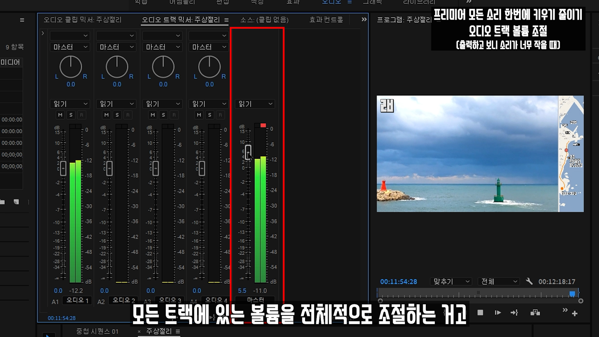 프리미어 모든 소리 한 번에 키우기 줄이기, 어도비 프리미어 영상 편집, 트랙별 소리 좌우 볼륨 조절.