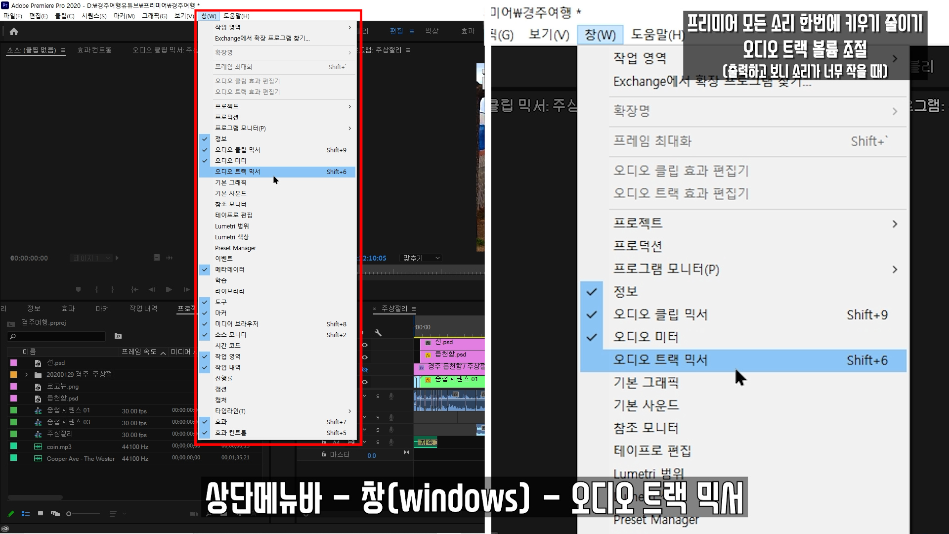 '상단 메뉴바 - 창(windows) - 오디오 트랙 믹서'를 클릭해주면 오디오 트랙 믹서 창이 뜹니다.