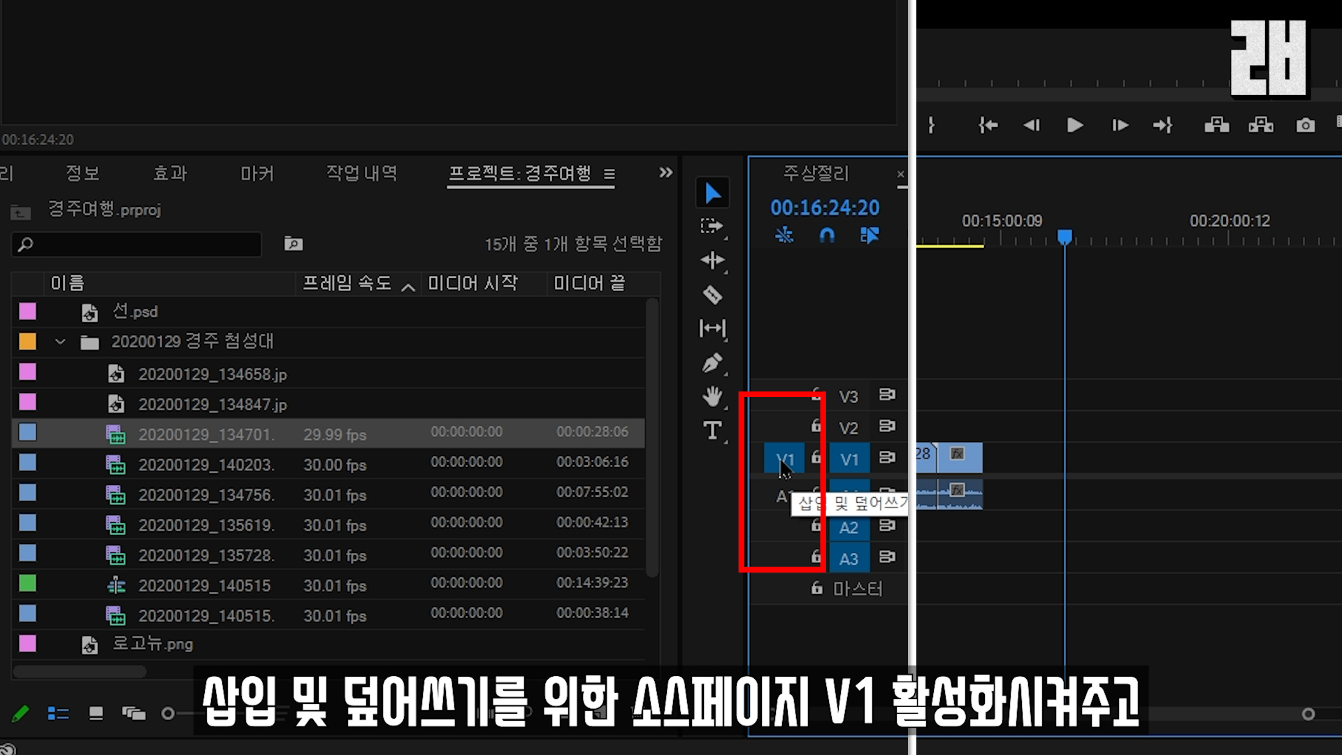 선택한 파일에서 비디오만 가져오고 싶으면 '삽입 및 덮어쓰기를 위한 소스패치 V1(빨간네모)'를 활성화 시켜주고, 가지고 오면 비디오만 가져와져요.