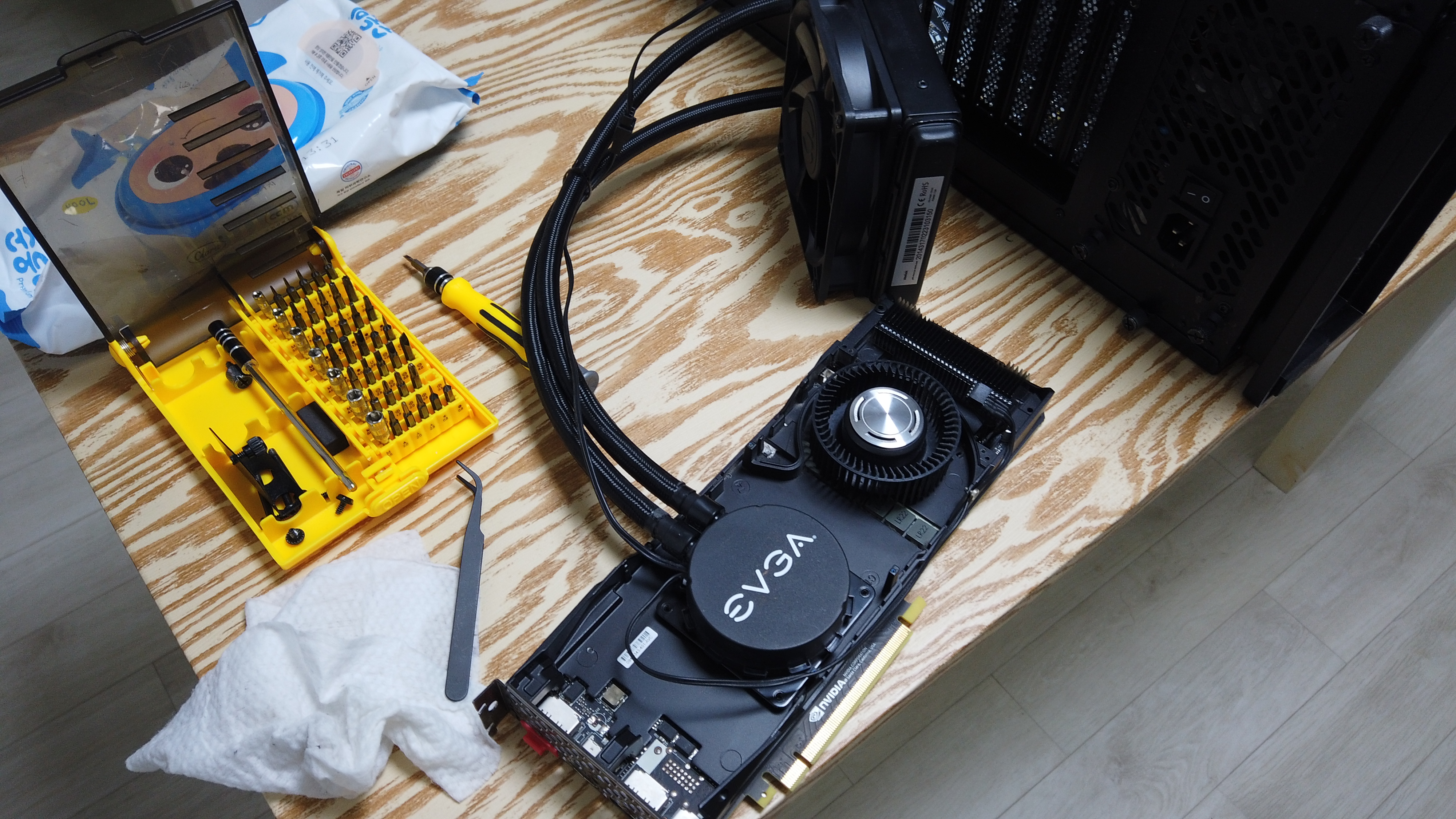 당시에 찾아낸 해결방법은, 파운더스 에디션을 분해하여 EVGA 일체형 수냉쿨러를 결합해주는 것입니다.