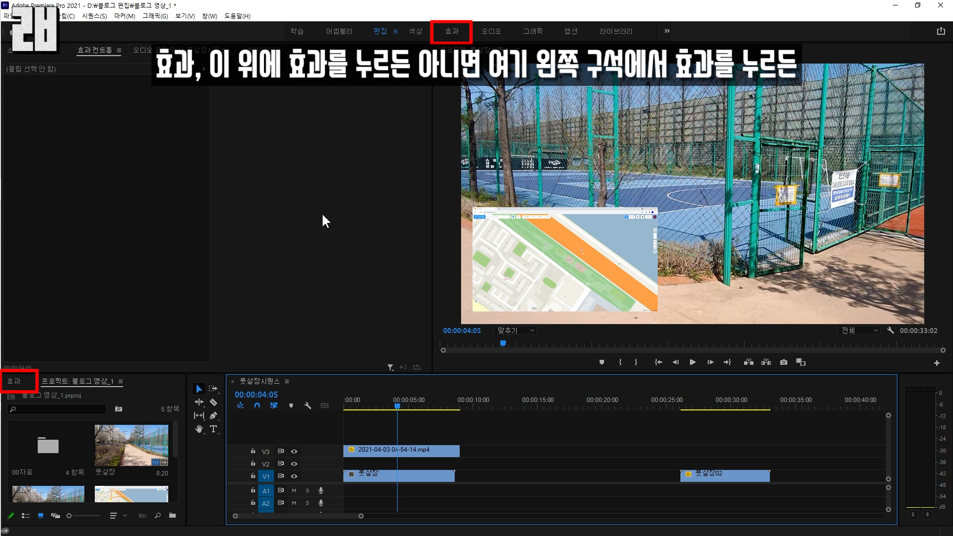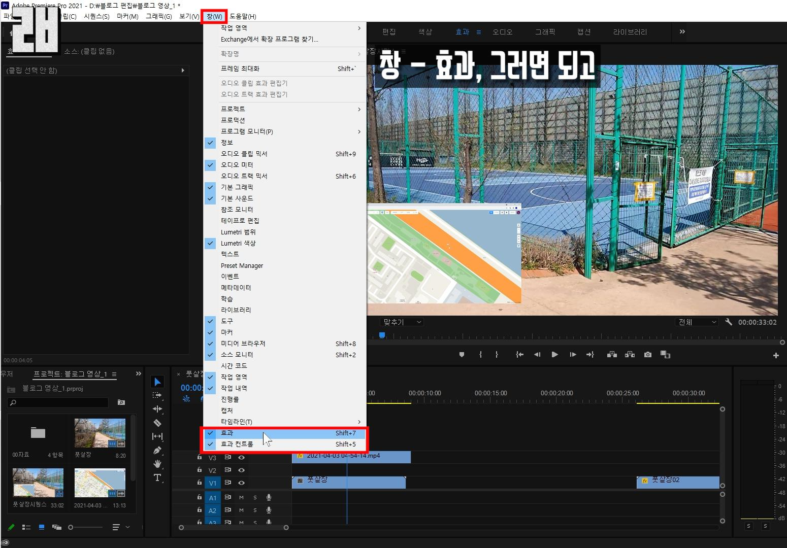 '효과 창이 보이지 않는다' 할 경우에는 상단 메뉴바에서