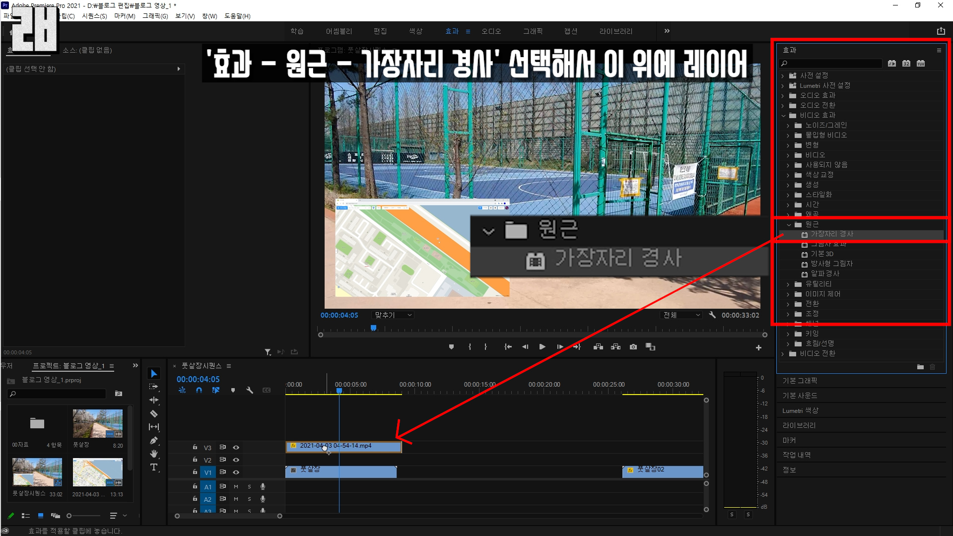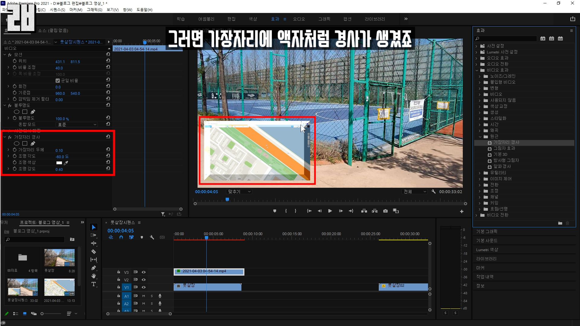효과창에서 '비디오 효과 - 원근 - 가장자리 경사' 선택해서
