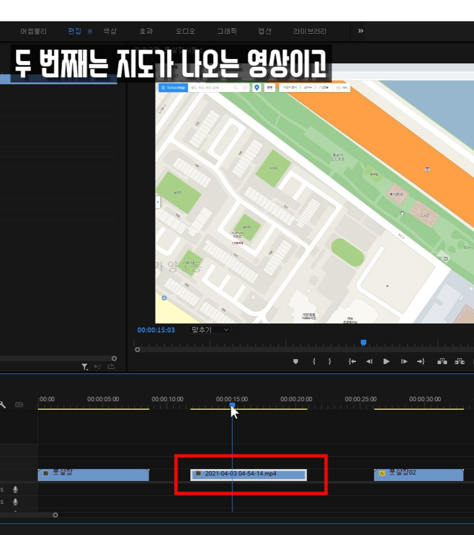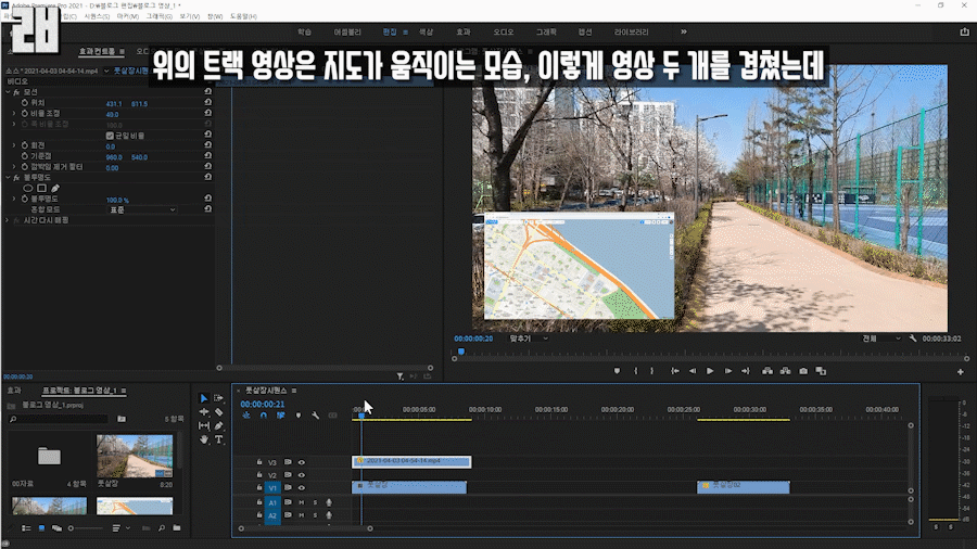 위의 트랙 영상은 지도가 움직이는 모습, 이렇게 영상 두 개를 겹쳤어요.