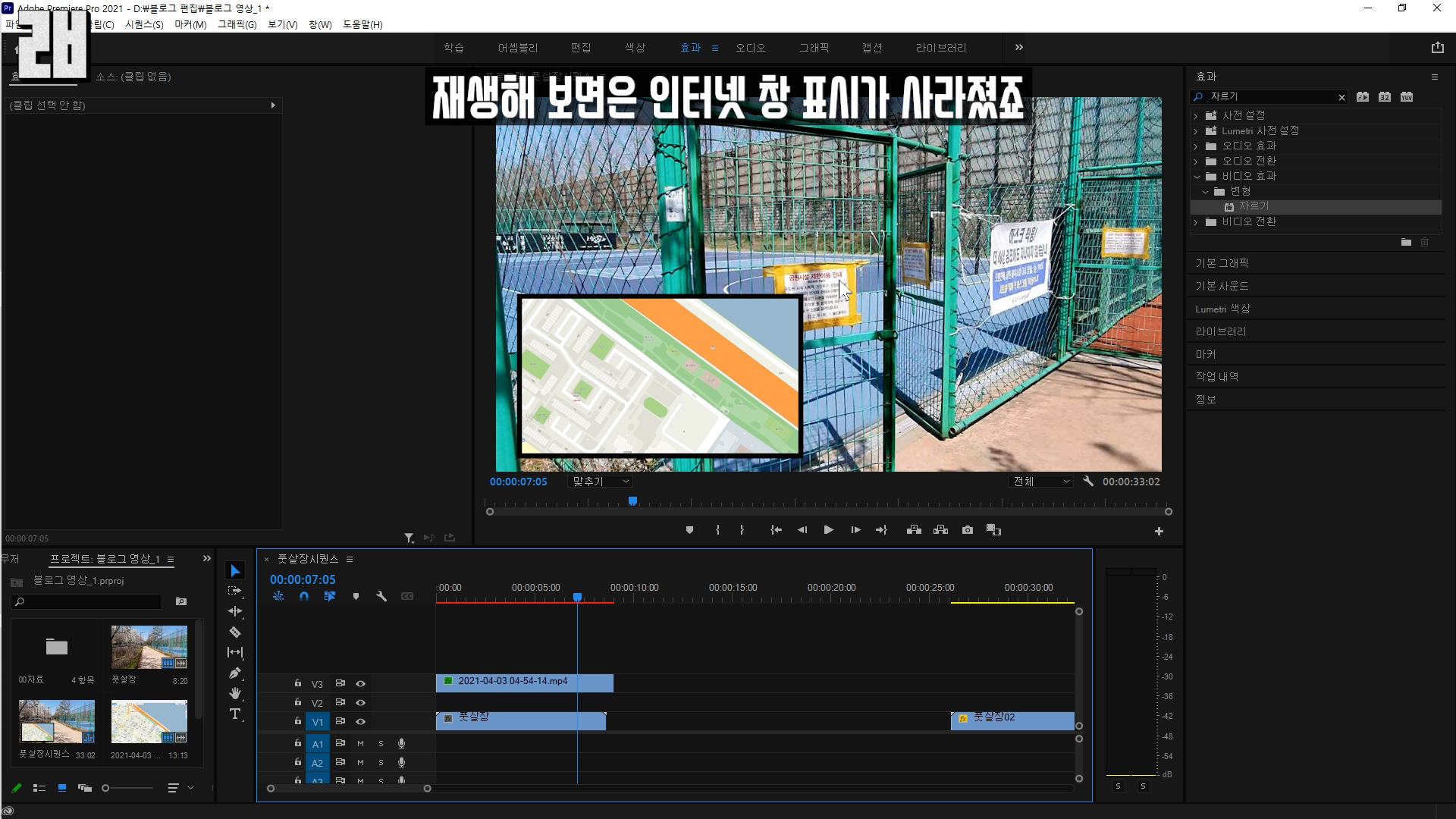 재생해 보면은 인터넷 창 표시가 사라졌죠.