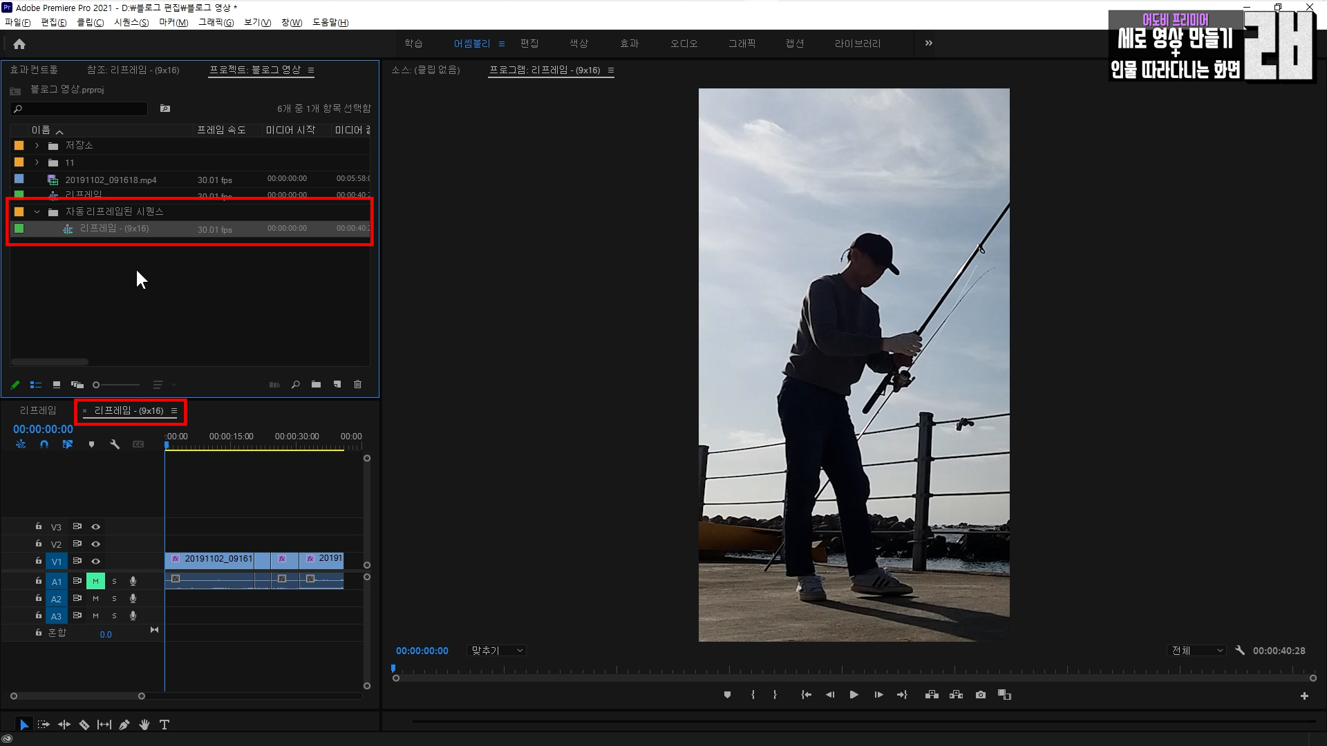 자동 리프레임 저장소(폴더)를 들어가면 리프레임 9:16 시퀀스가 생겼습니다.