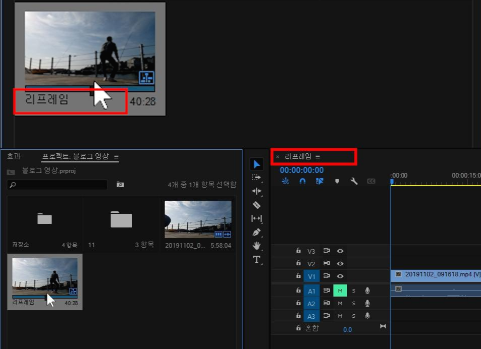 프로젝트 창에 '리프레임 시퀀스'가 보이죠.