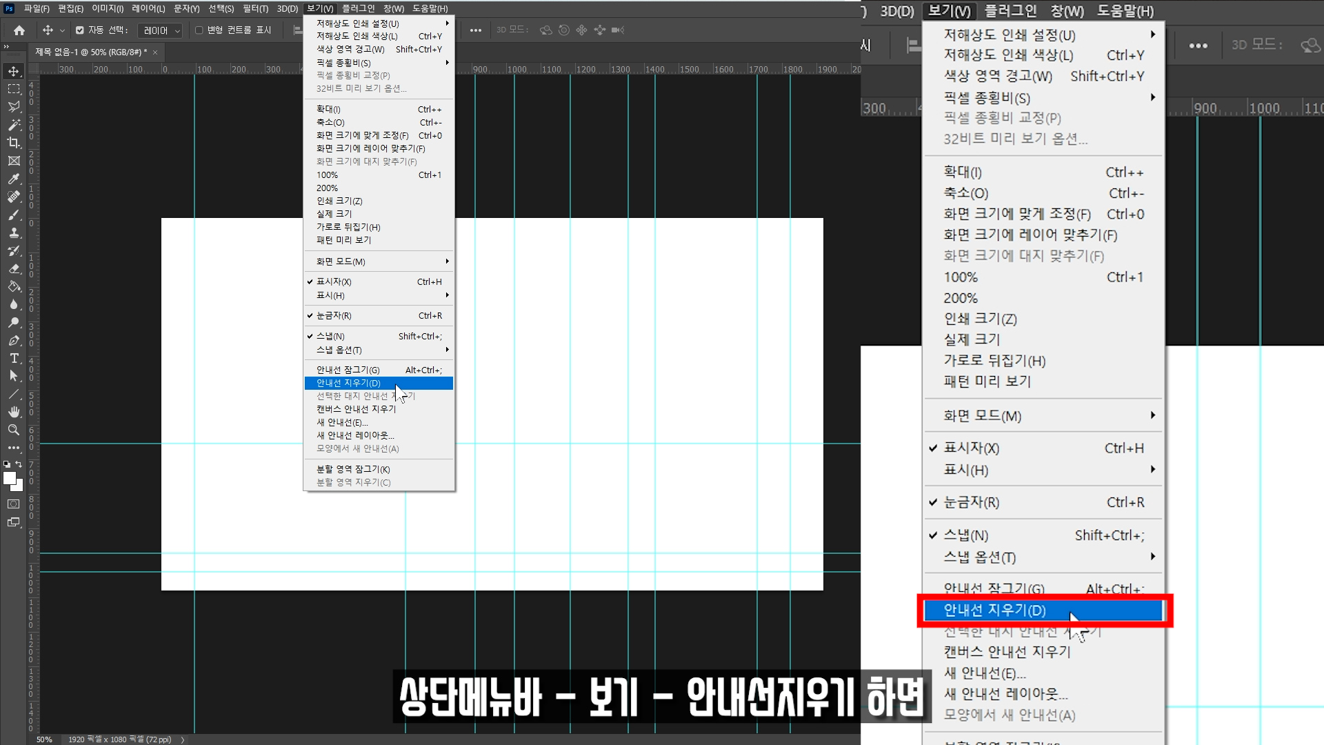 한 번에 모든 안내선을 지우는 방법은 '상단 메뉴바-보기-안내선 지우기'.