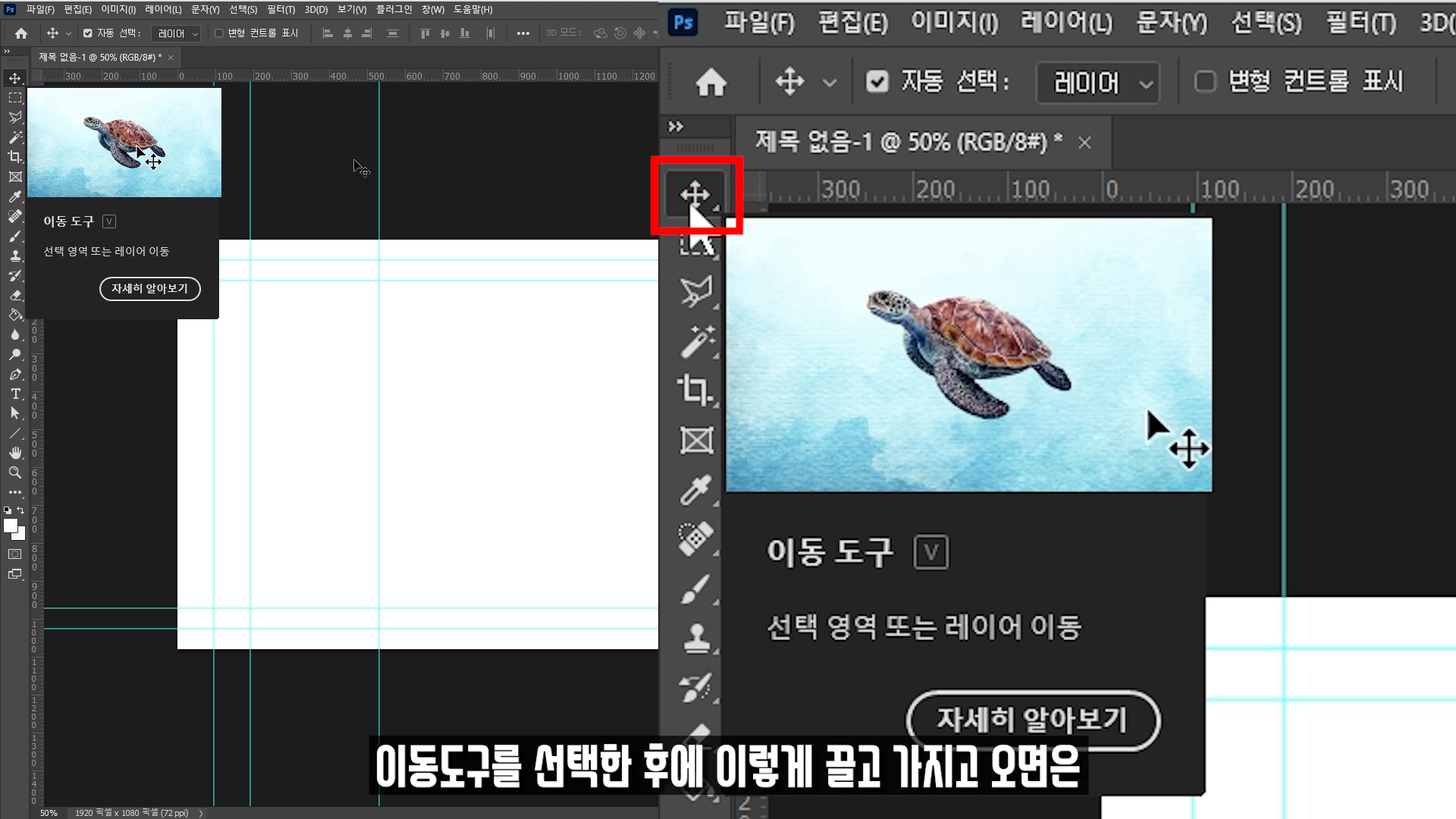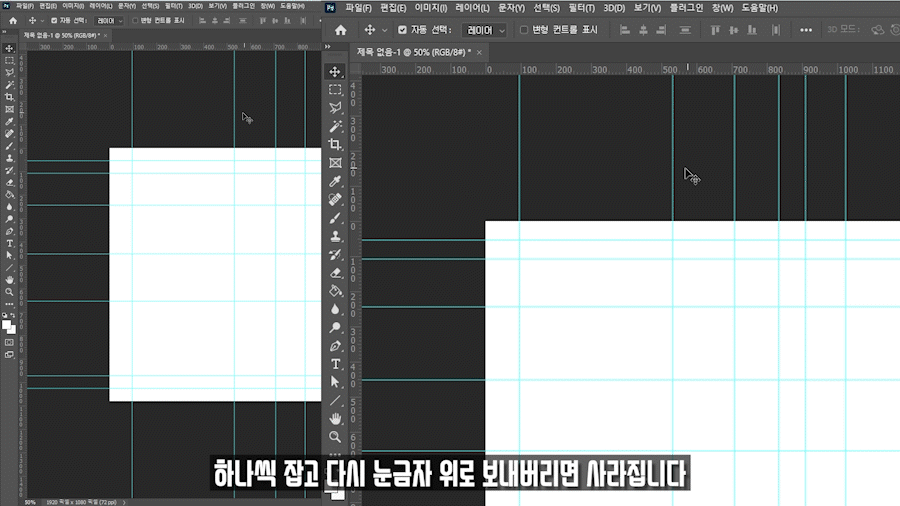 반대로 안내선을 없애려면, 이동 도구를 선택한 후 (단축키 v) 안내선을 잡고 테두리의 눈금자로 보내면 됩니다.