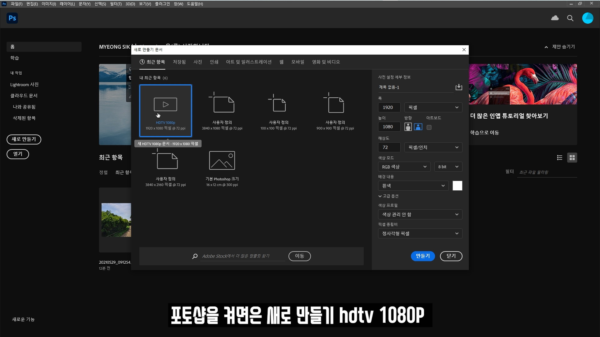 이 덕분에 새로 만들기 'hdtv 1080p' 이거를 선택해서 자주 만들게 됩니다.