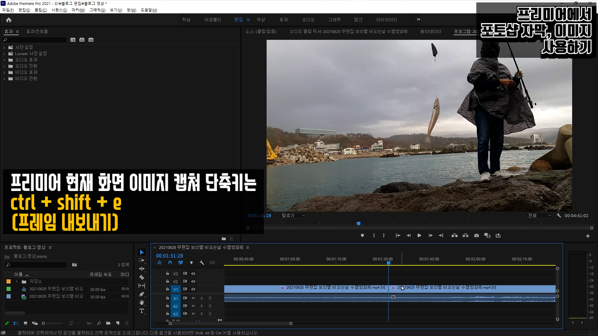 일단 프리미어 꿀팁으로 현재 화면 이미지 파일로 캡쳐하는 단축키는 'ctrl + shift + e' 입니다 (프리미어 화면 캡처 방법, 프레임 내보내기 단축키).