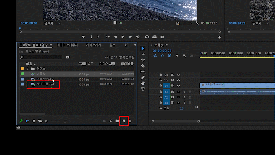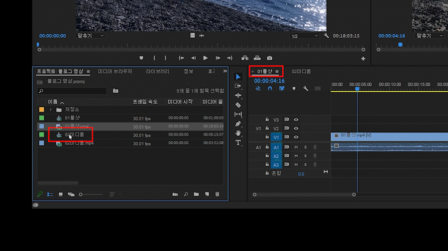 위 움짤을 보면 '02미디움' 영상 파일을 '새 항목(구석 접힌 종이 모양 버튼)에 가져다 놓으니 새로운 시퀀스(타임라인)가 만들어진 것을 볼 수 있습니다.