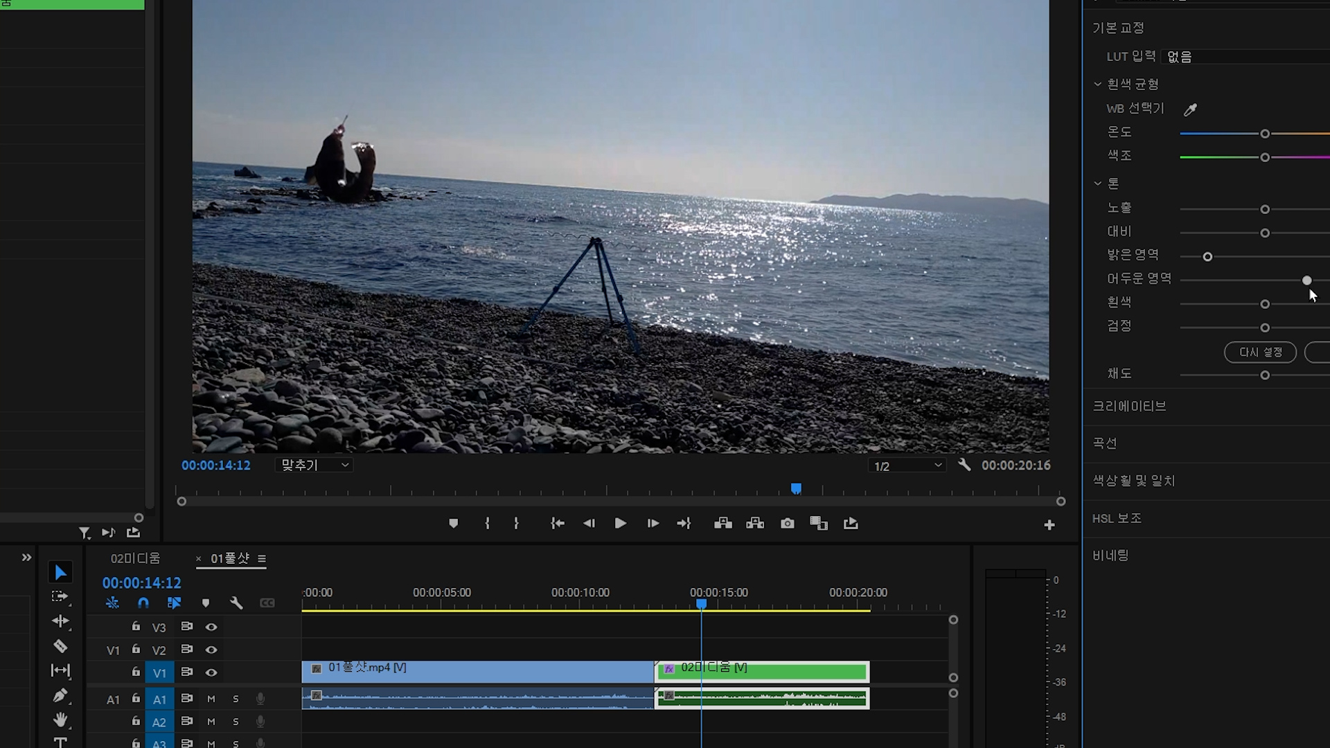 시퀀스 클립을 선택하고 색을 조절하는 모습입니다.