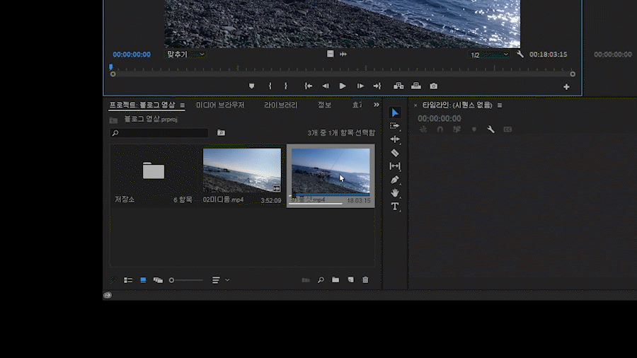 혹은 영상파일을 잡고 끌어서 아래의 '새항목' 버튼에 놓으면 새로운 시퀀스(타임라인)가 만들어집니다.