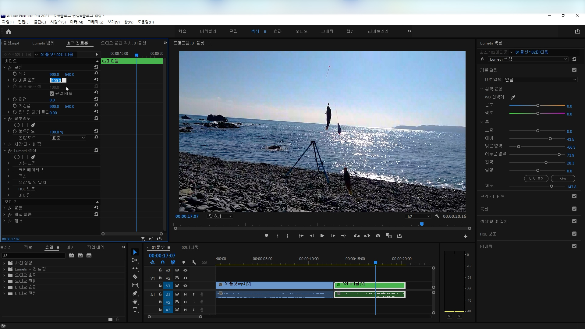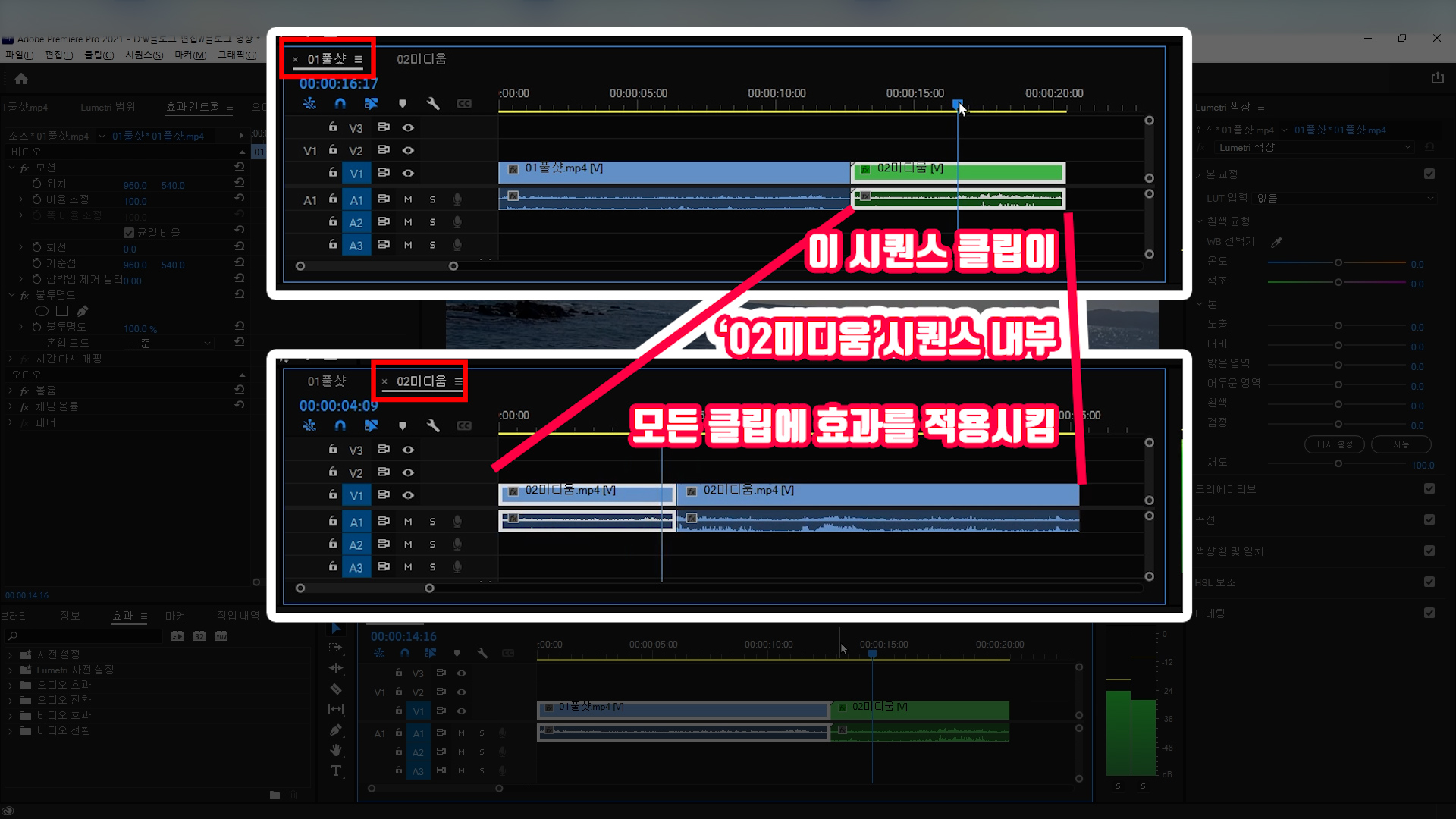 시퀀스 클립 안에 수많은 영상이 있어도 모두 같은 색상 조절 효과가 적용됩니다.
