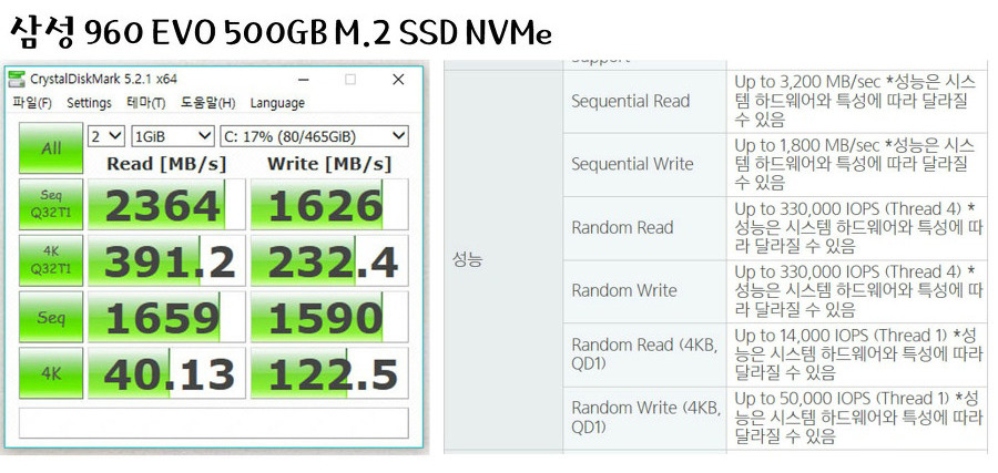제품 공인 수치보다는 낮은 속도지만, 성능을 시스템 하드웨어와 특성에 따라 달라질 수 있는 정도라고 생각해요.