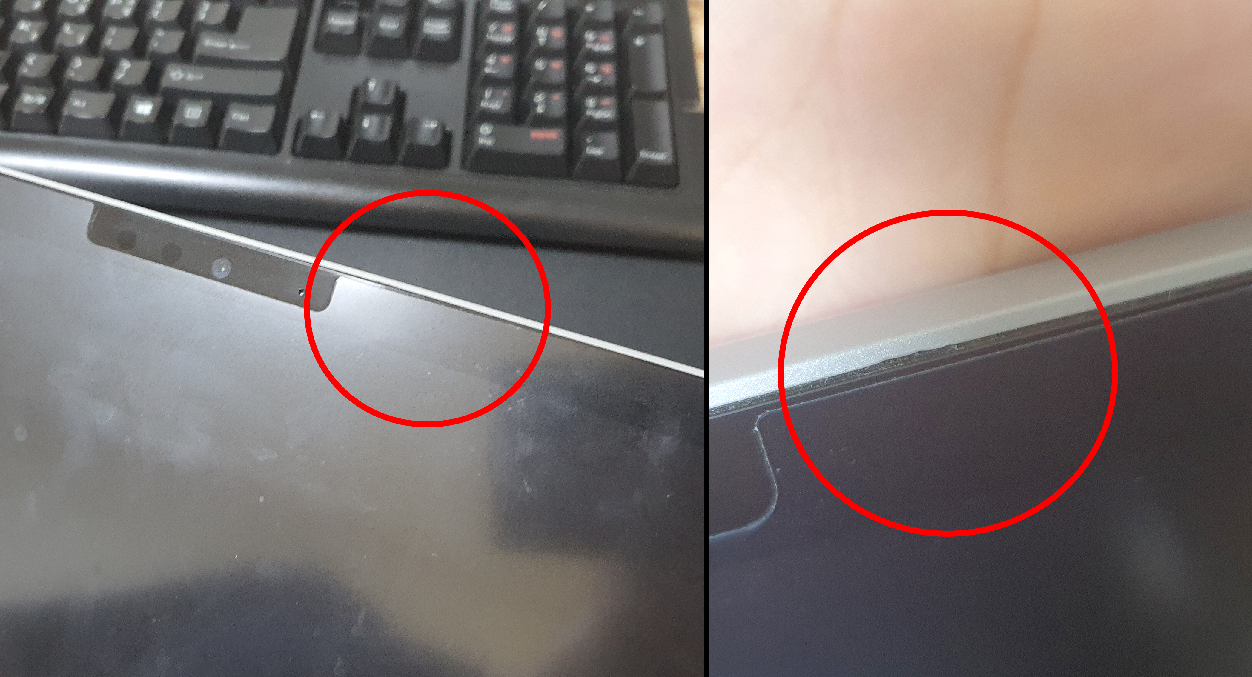 액정 윗부분 접착면을 자세히 보면 얄은 송곳이나 핀같은 걸로 윗면을 뜯어낸 흔적이 보입니다.
