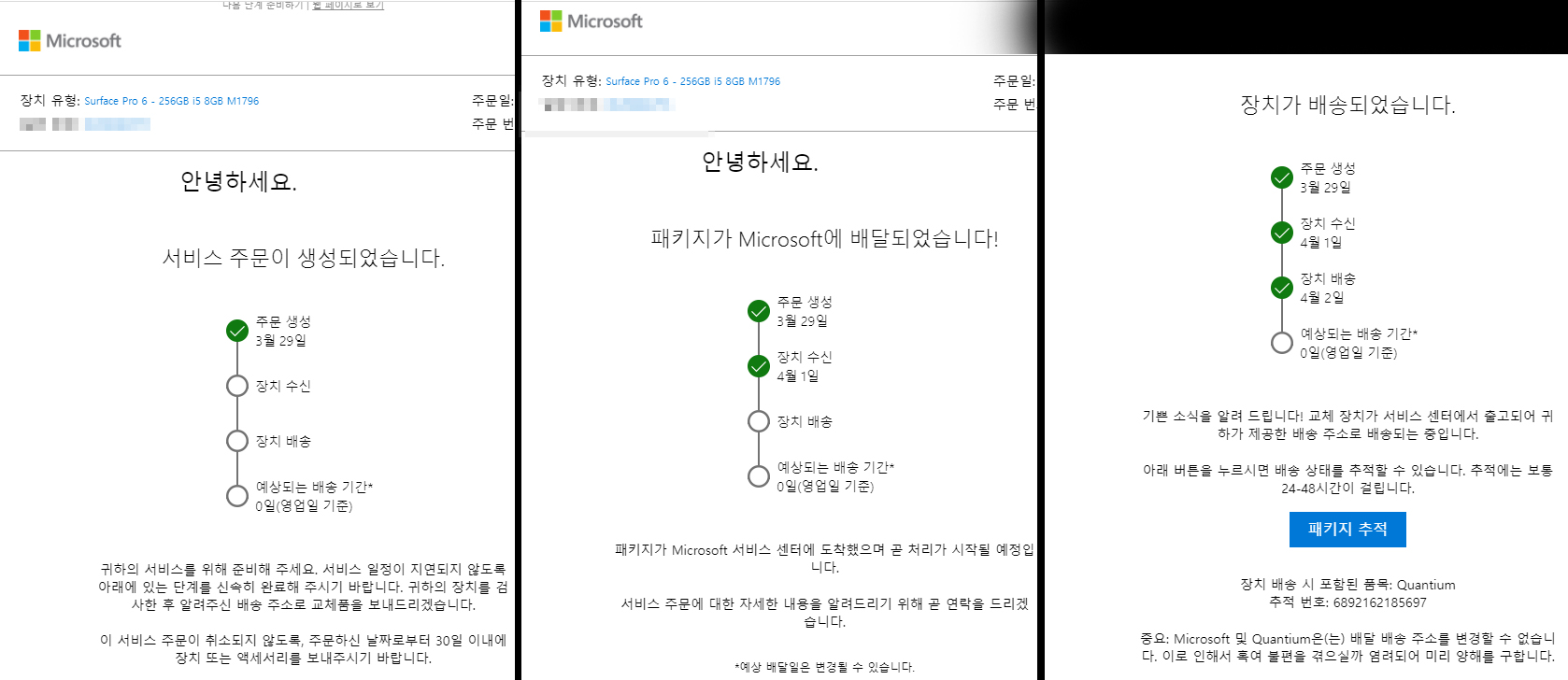 마이크로소프트 사이트에서 3월 29에 수리 주문을 작성했어요.