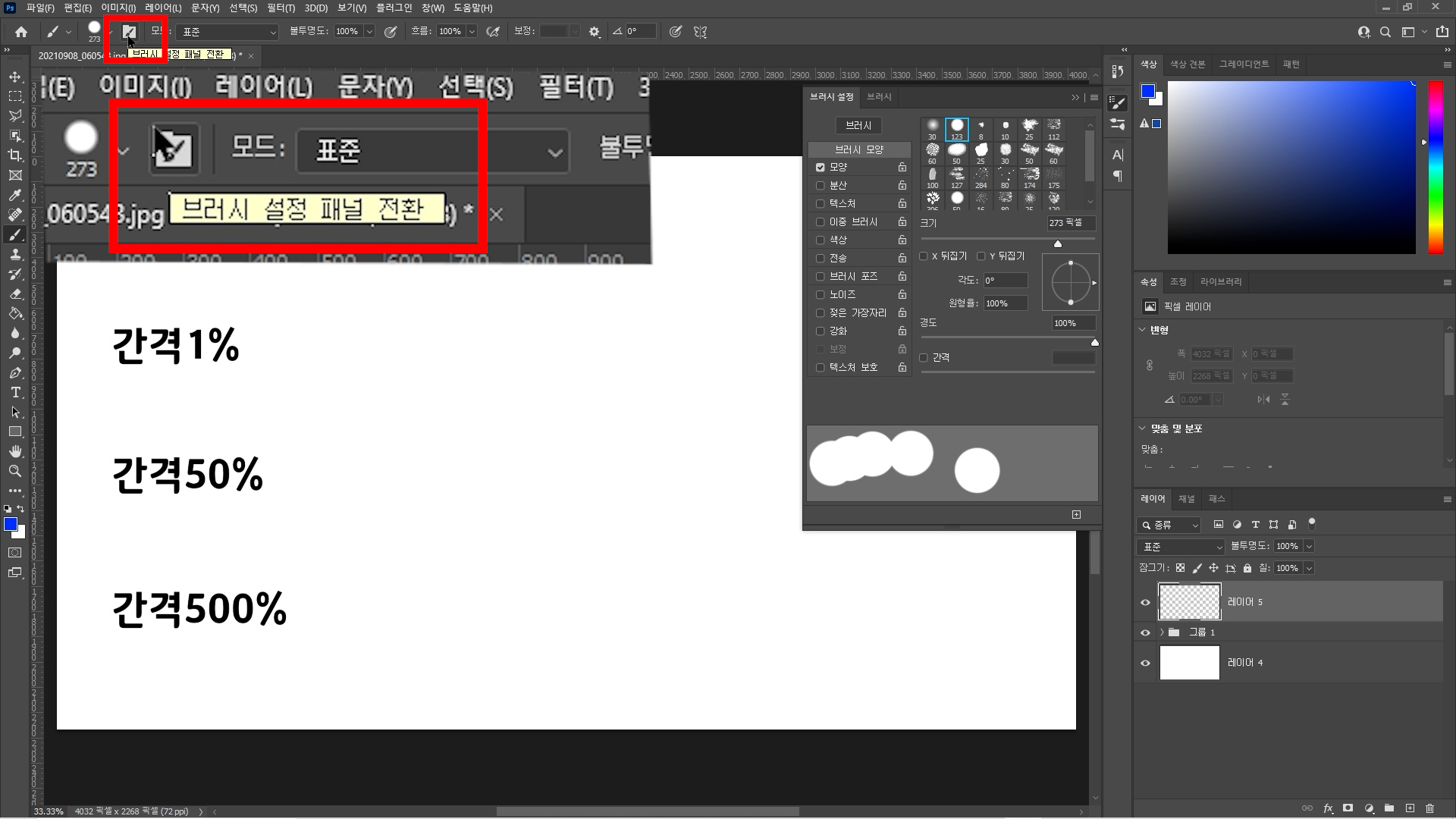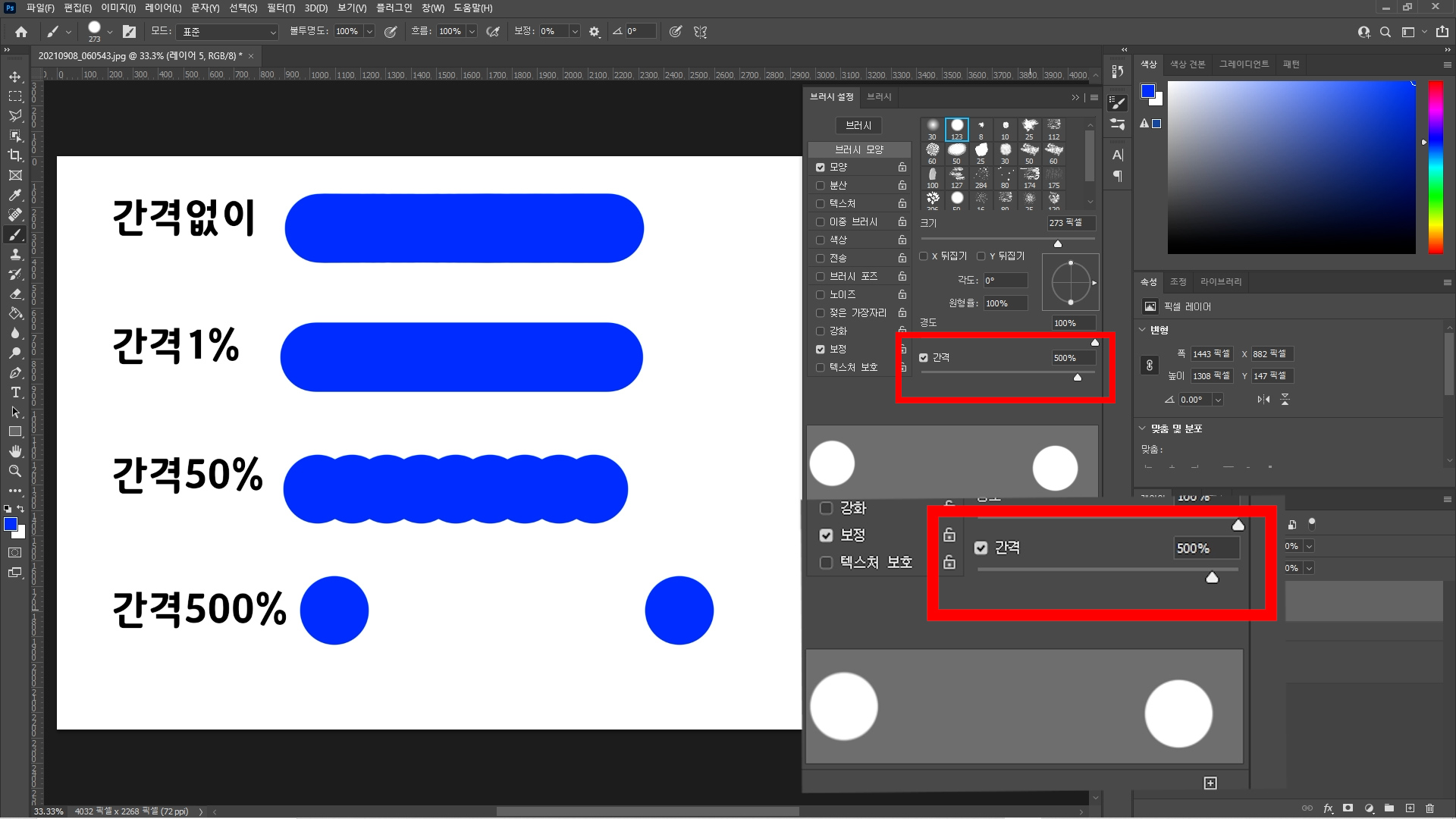 포토샵 브러시(브러쉬) 간격 넓어졌을 때, 브러시 간격 조절 방법.