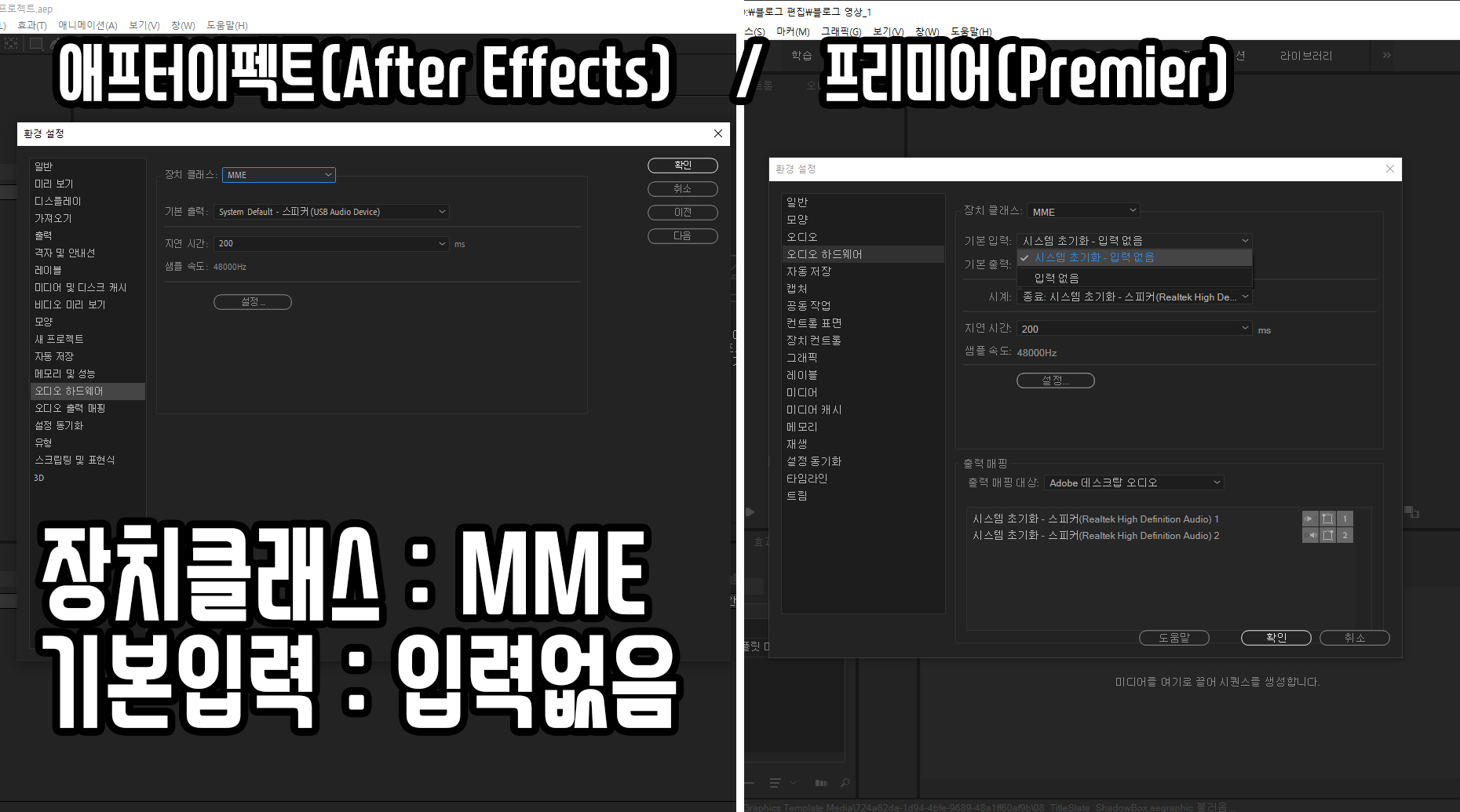 애프터 이펙트(After Effects)가 오디오 하드웨어를 제대로 설정하지 못해서 발생합니다.