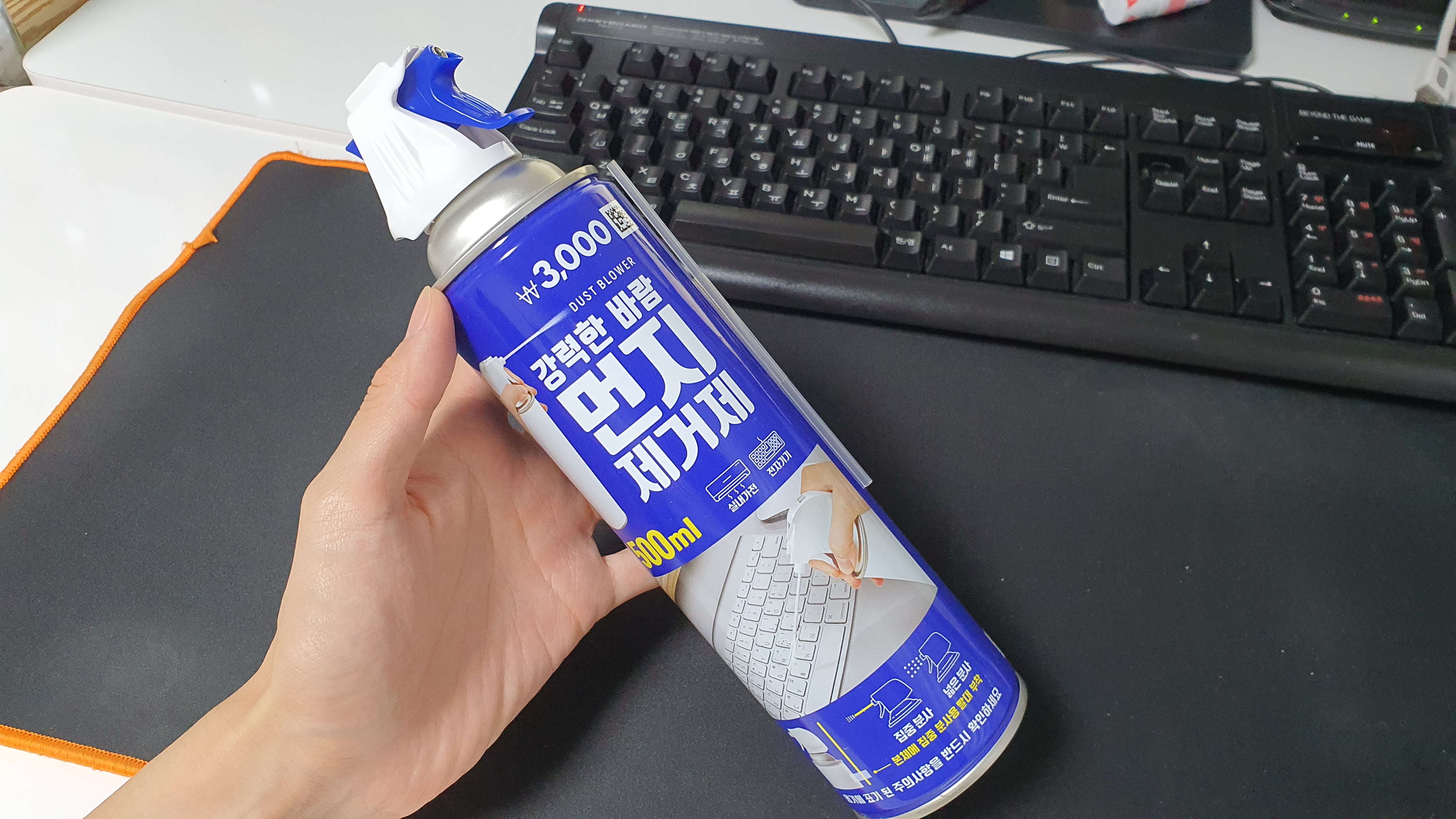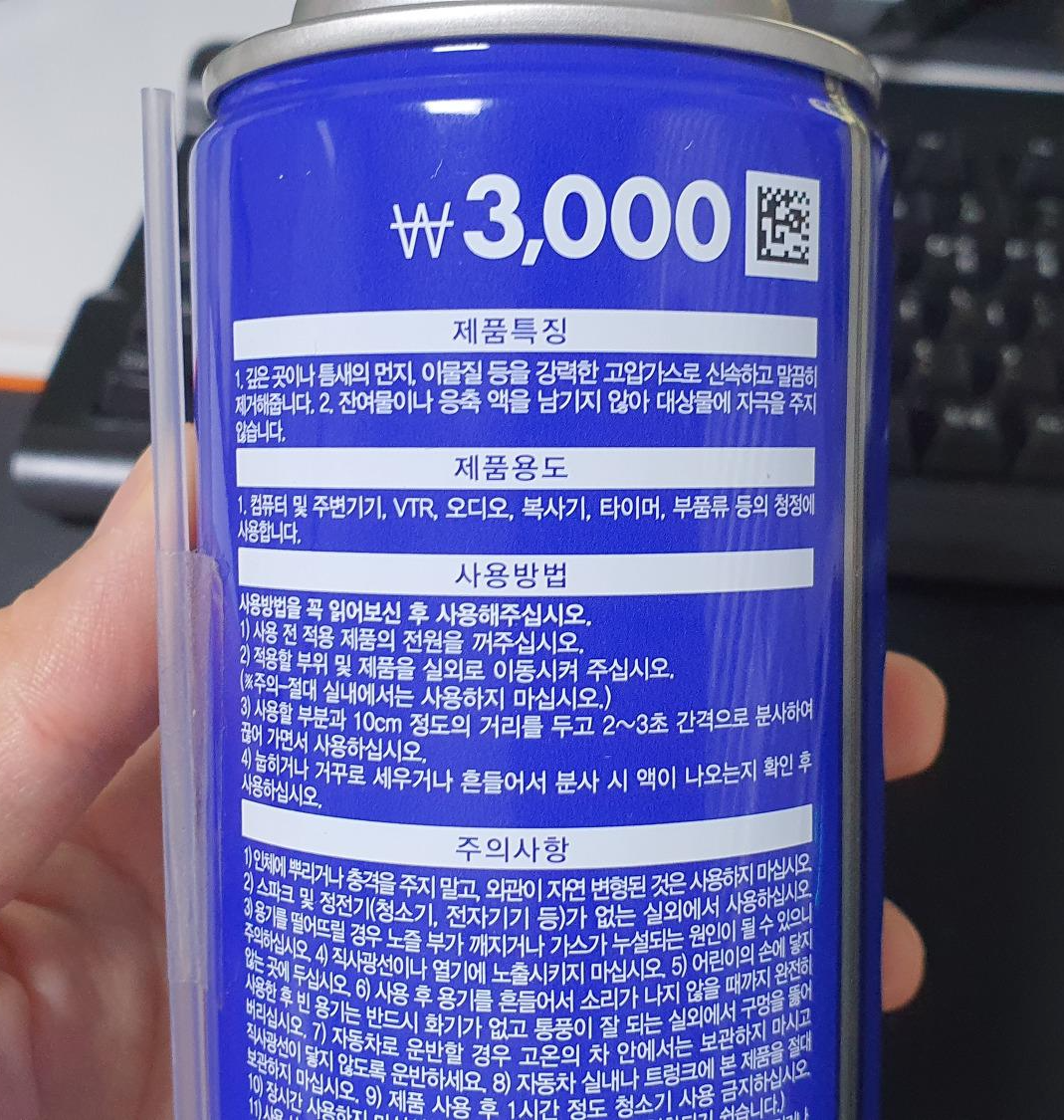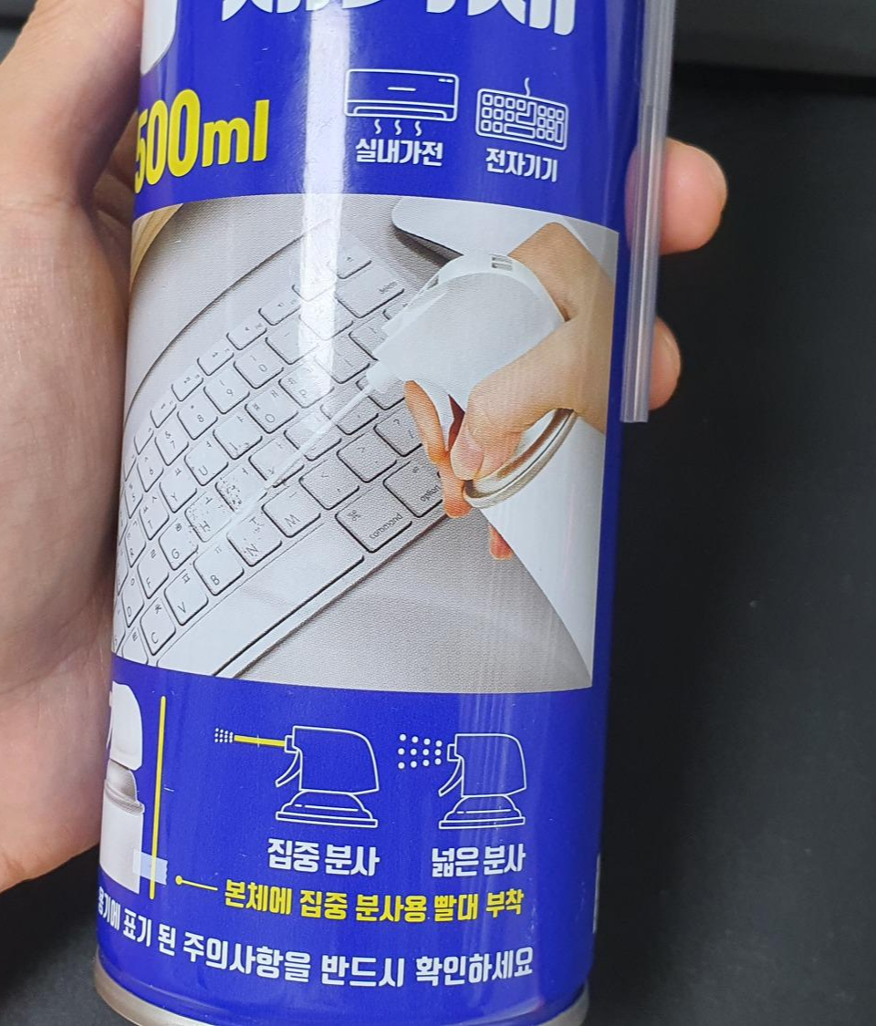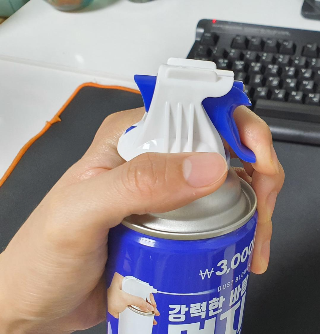 다이소에서 구매한 먼지 제거 스프레이(휴대용 에어프레셔, air pressure)를 뒤집어서 사용하면 바람이 강하게 나옵니다.