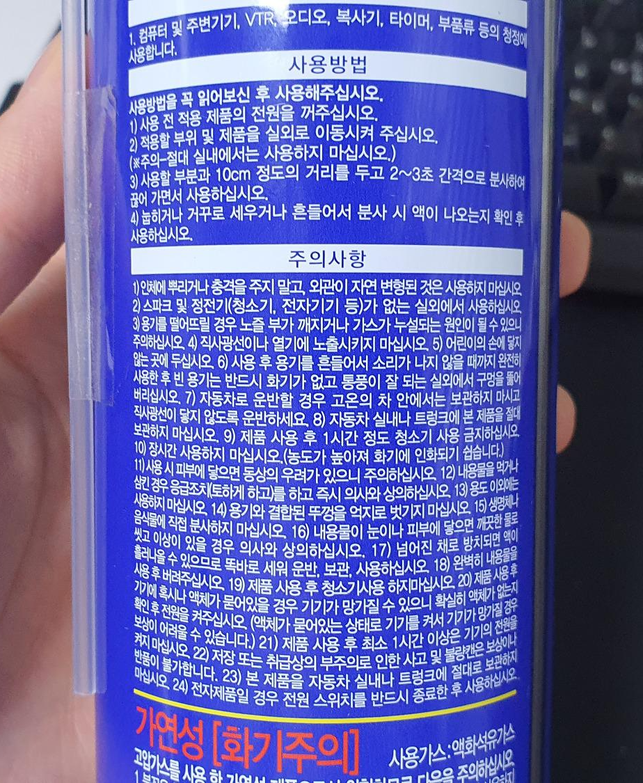 인체에 뿌리거나 충격을 주지 말고외관이 자연 변형된 것은 사용하지 마십시오. 스파크 및 정전기가 없는 실외에서 실외에서 사용하십시오. 용기를 떨어뜨릴 경우 노출 부가 깨지거나 가스가 누설되는 원인이 될 수 있으니 주의하십시오. 사용후 용기를 흔들어서 소리가 나지 않을 때까지 완전히 사용한 후 빈 용기는 반드시 화기가 없고 통풍이 잘 되는 실외에서 구멍을 뚫어 버리십시오. 자동차 실내나 트렁크에 본 제품을 절대 보관히지 마십시오. 제품 사용 후 1시간 정도 청소기 사용 금지하십시오. 장시간 사용하지 마십시오(농도가 높아져 화기에 인화되기 쉽습니다). 사용시 피부에 닿으면 동상의 우려가 있으니 주의하십시오. 내용물을 먹거나 삼킨 경우 응급조치(토하게 하고)를 하고 즉시 의사와 상의하십시오. 용기와 결합된 뚜껑을 억지로 벗기지 마십시오. 생명체나 음식물에 직접 분사하지 마십시오. 넘어진 채로 방치되면 액이 흘러나올 수 있으므로 똑바로 세워 운반, 보관 사용 하십시오. 제품 사용 후 기기에 혹시나 액체가 묻어 있을 경우 기기가 망가질 수 있으니 확실 히 액체가 없는지 확인 후 전원을 켜주십시오. 제품 사용 후 최소 1시간 이상은 기기의 전원을 켜지 마십시오.