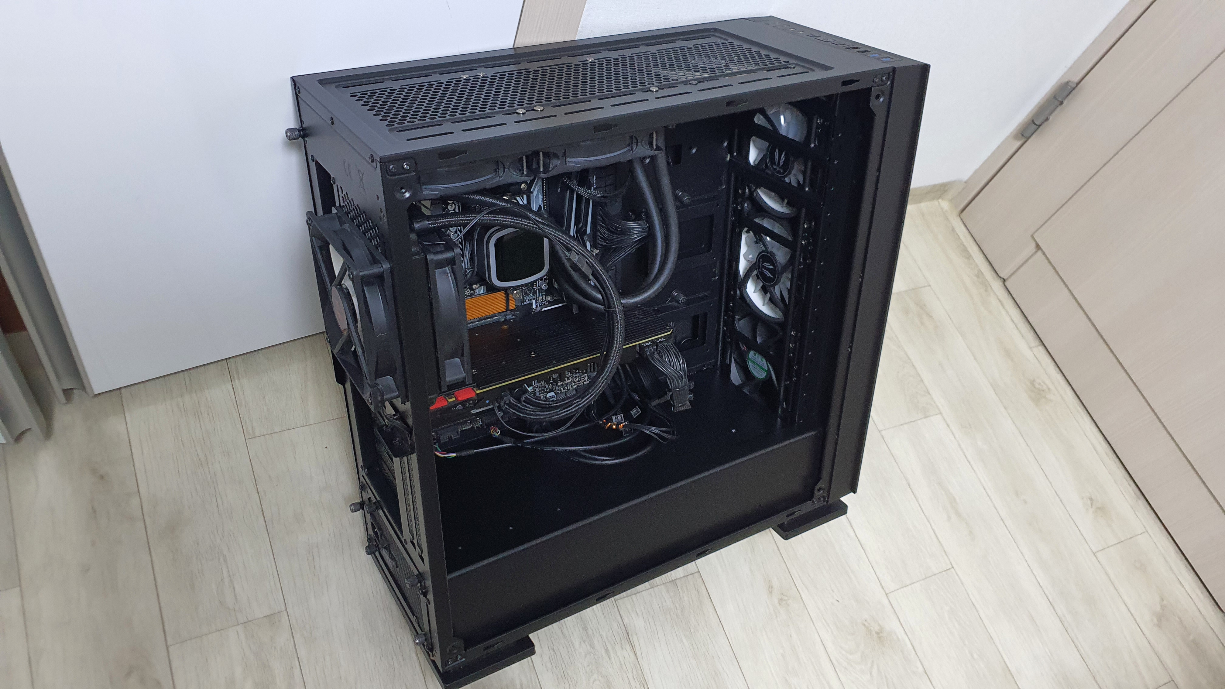 그래픽카드와 연결된 '일체형 수냉 쿨러 라디에이터 그릴'의 열을 식혀주려고(발열 잡는 법) 쿨러를 추가로 붙였어요.