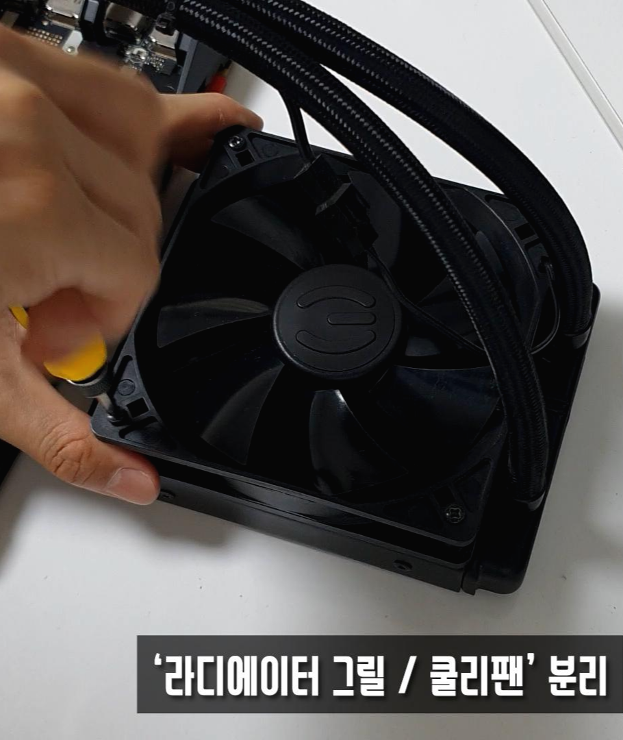 수냉 쿨러의 라디에이터와 쿨링 팬을 분리해 줍니다.