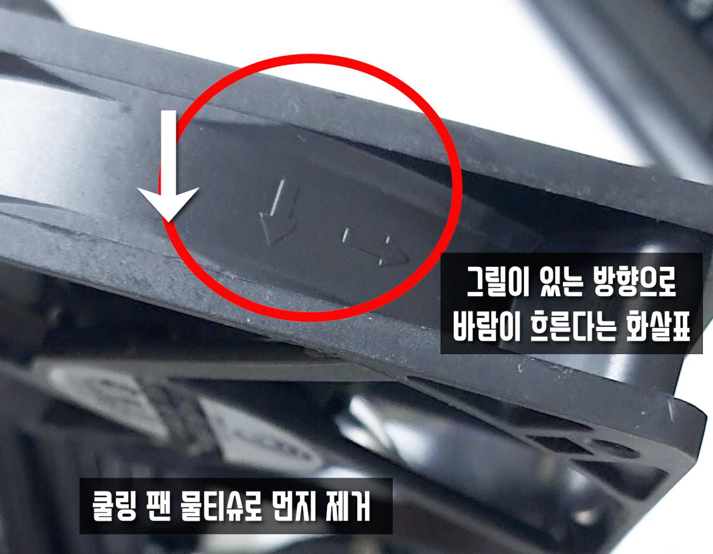 종종 쿨링팬 방향이 헷갈릴 때가 있는데, 일부 쿨러 제품들은 측면에 바람 방향이 표시되어 있어요.
