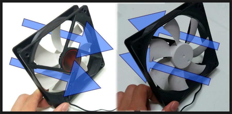쿨링 팬(쿨러) 공기 흐름 바람 방향 (쿨러 설치 방향). air flow, wind direction.