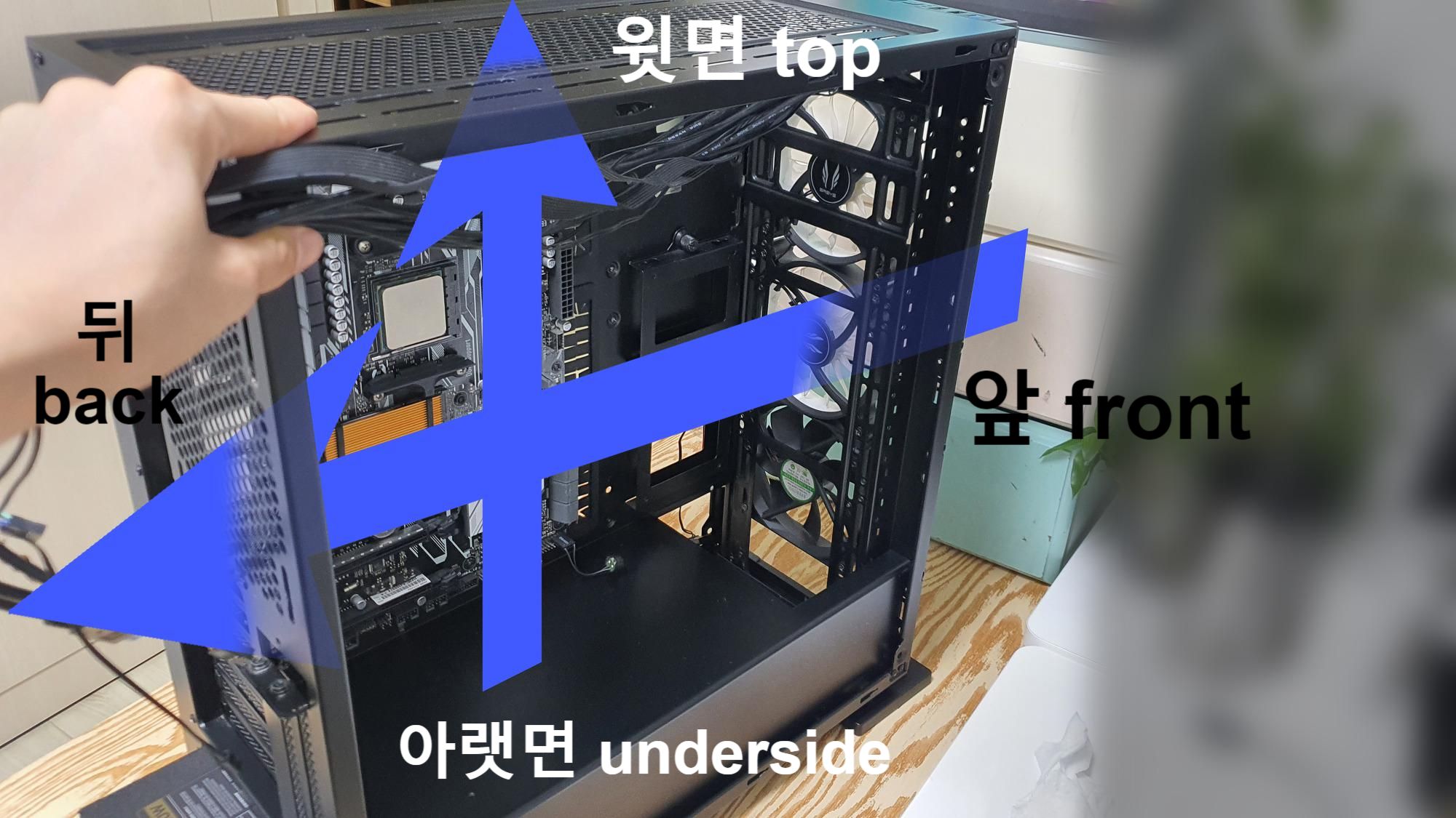 본체 전면에는 쿨러(쿨링팬) 그릴이 없는 면이 전면으로 가도록 설치합니다.