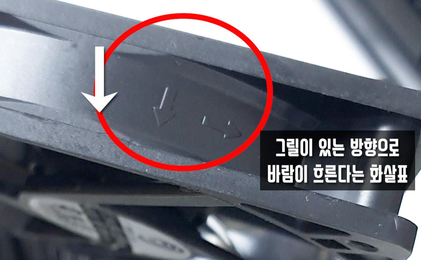 종종 쿨링 팬(쿨러/cooling fan) 방향이 헷갈릴 때가 있는데, 일부 쿨러 제품들은 측면에 바람 방향이 표시되어 있어요.