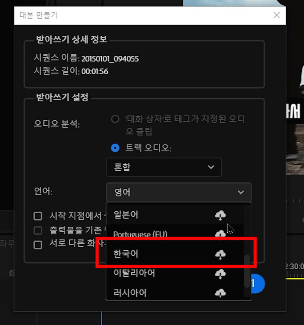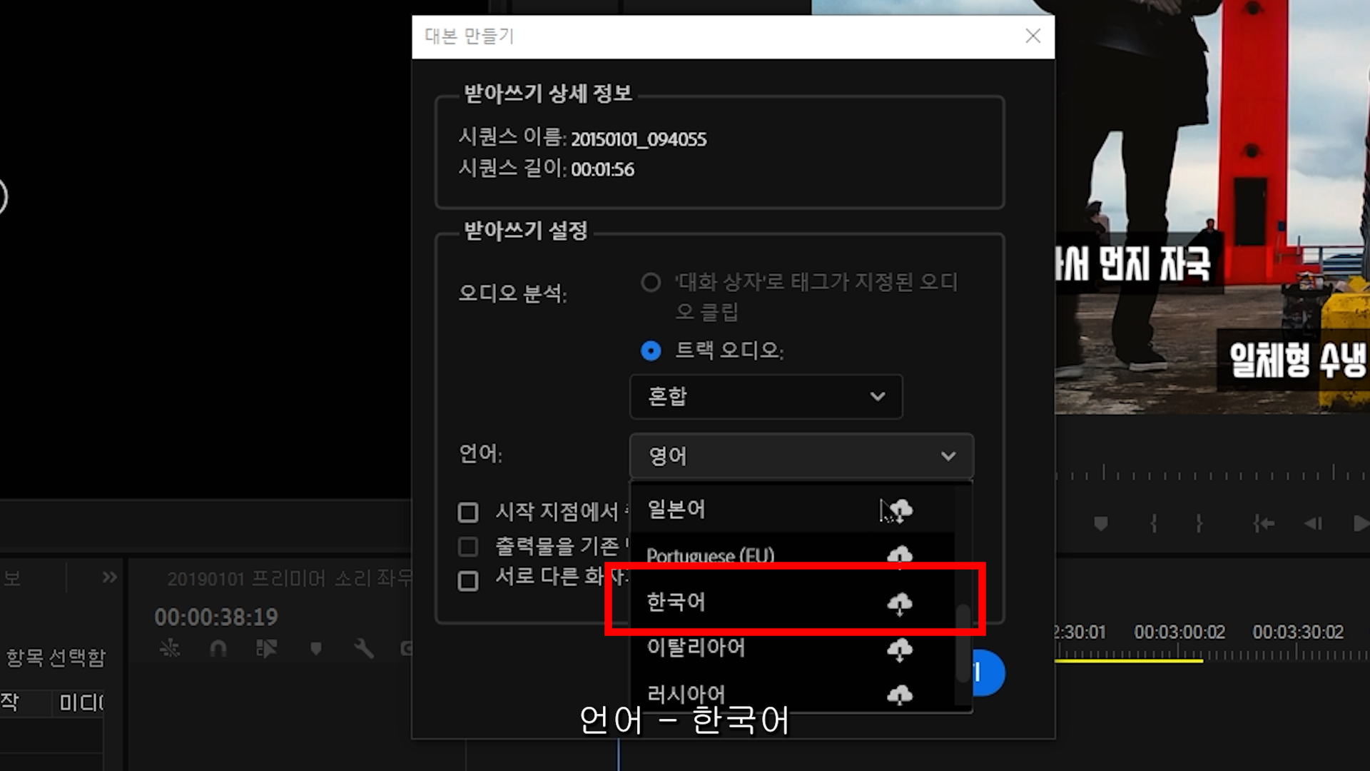 어도비 프리미어 자동 자막 기능, 자동 대본 기능.