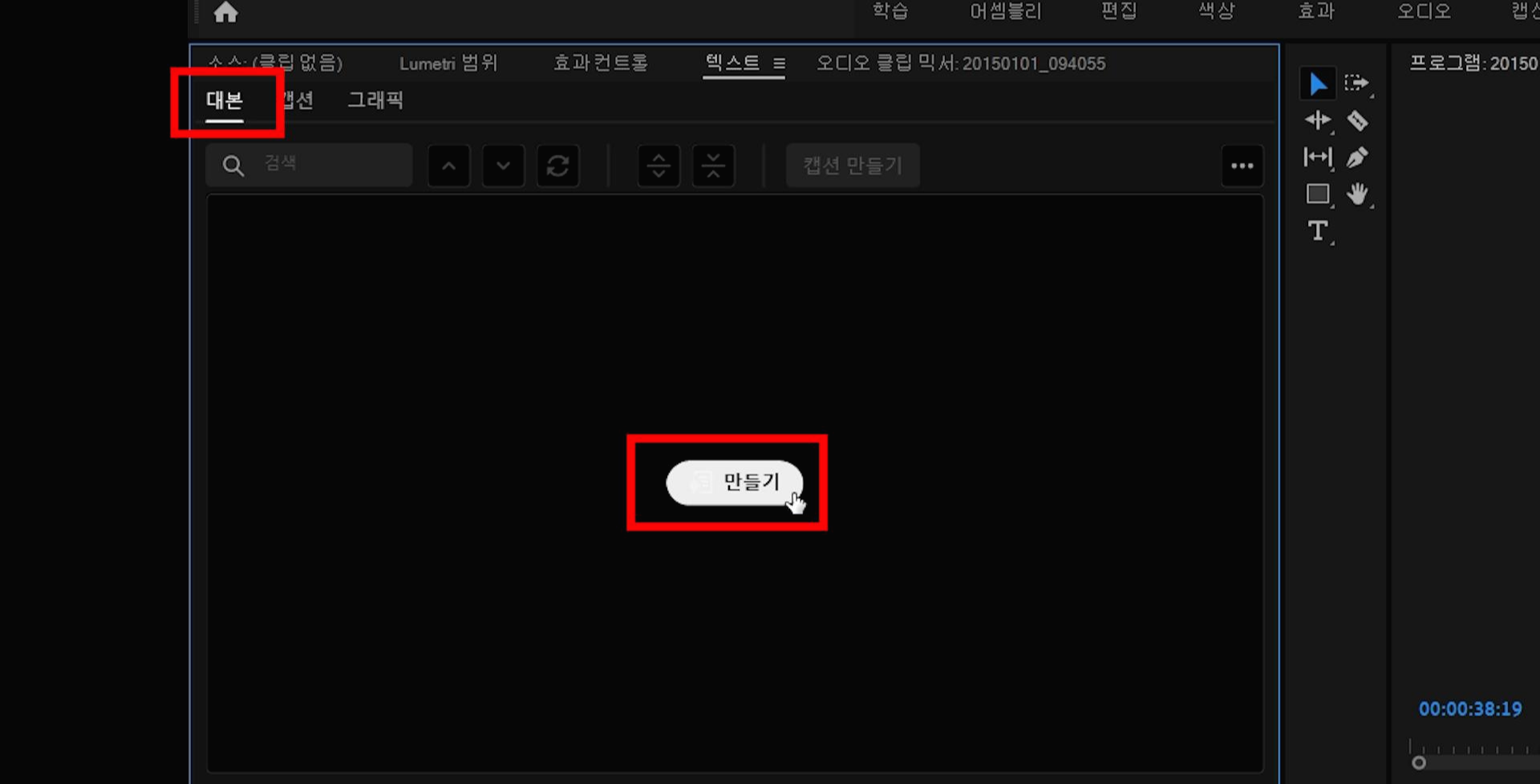 프리미어 '텍스트 패널'에서 자동 받아쓰기 기능을 실행합니다.