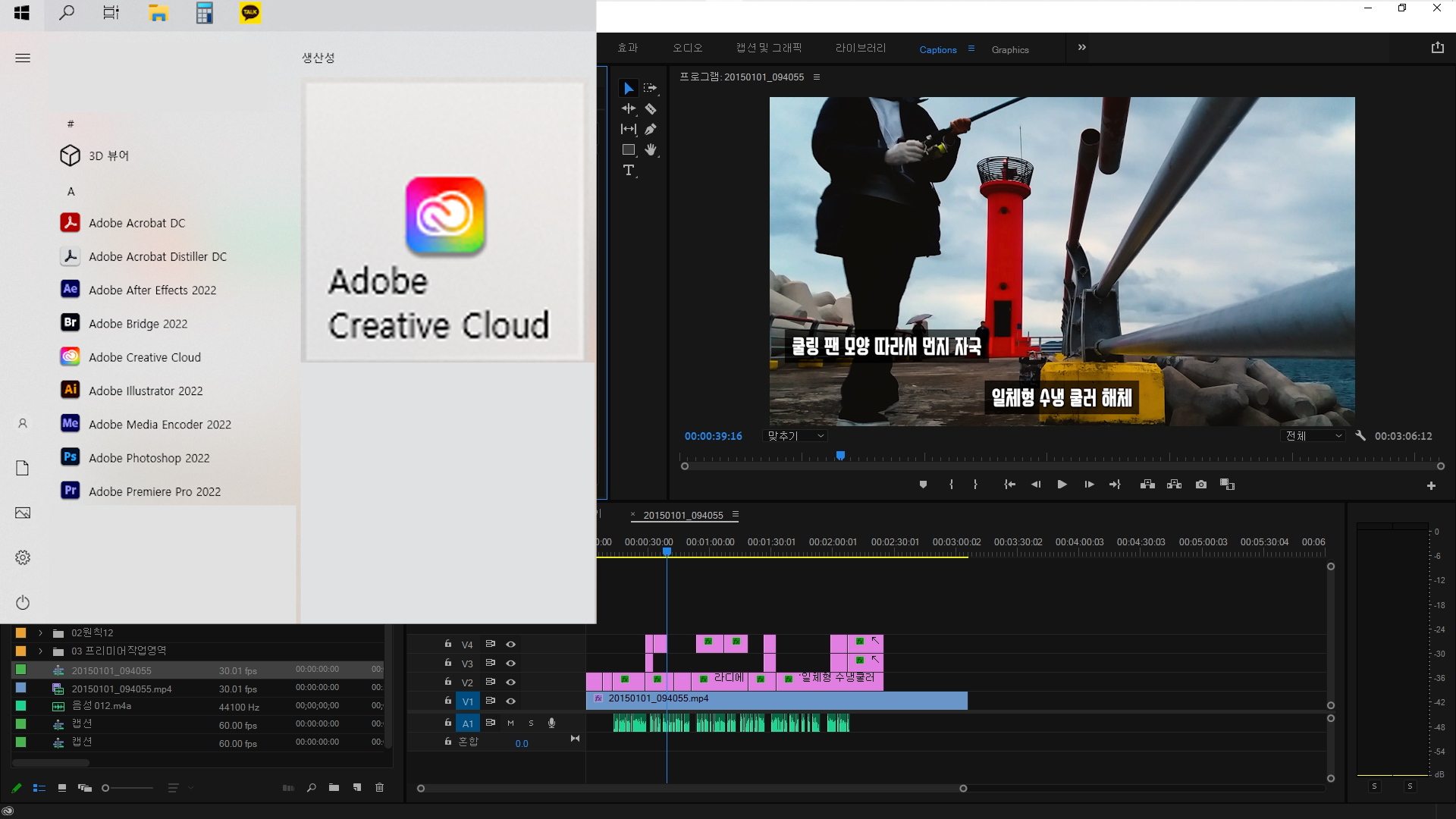 하지만 저는 시작할 때 '어도비 크리에이티브 클라우드 앱'이 작동되지 않게 해 놨기 때문에 프리미어 자막 작성 기능이 정상적으로 작동하지 않았던 것 같습니다.