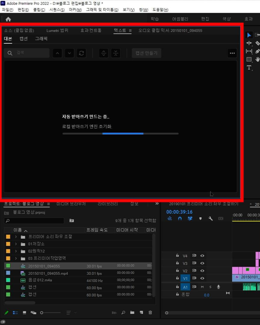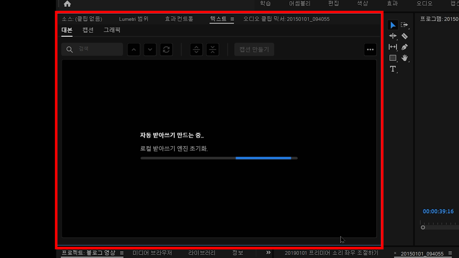 프리미어 자동 텍스트(자막, 대본, 문자) 기능이 안 될 때, 로컬 받아쓰기 엔진 초기화 안돼, 자동 텍스트, 오토 텍스트.