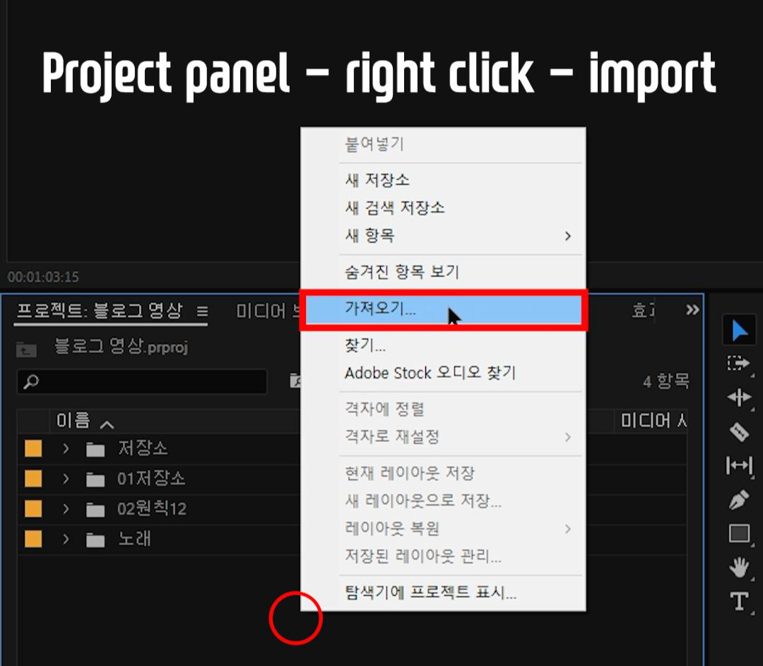 프로젝트 패널에서 '우클릭', '가져오기'를 눌러줍니다.