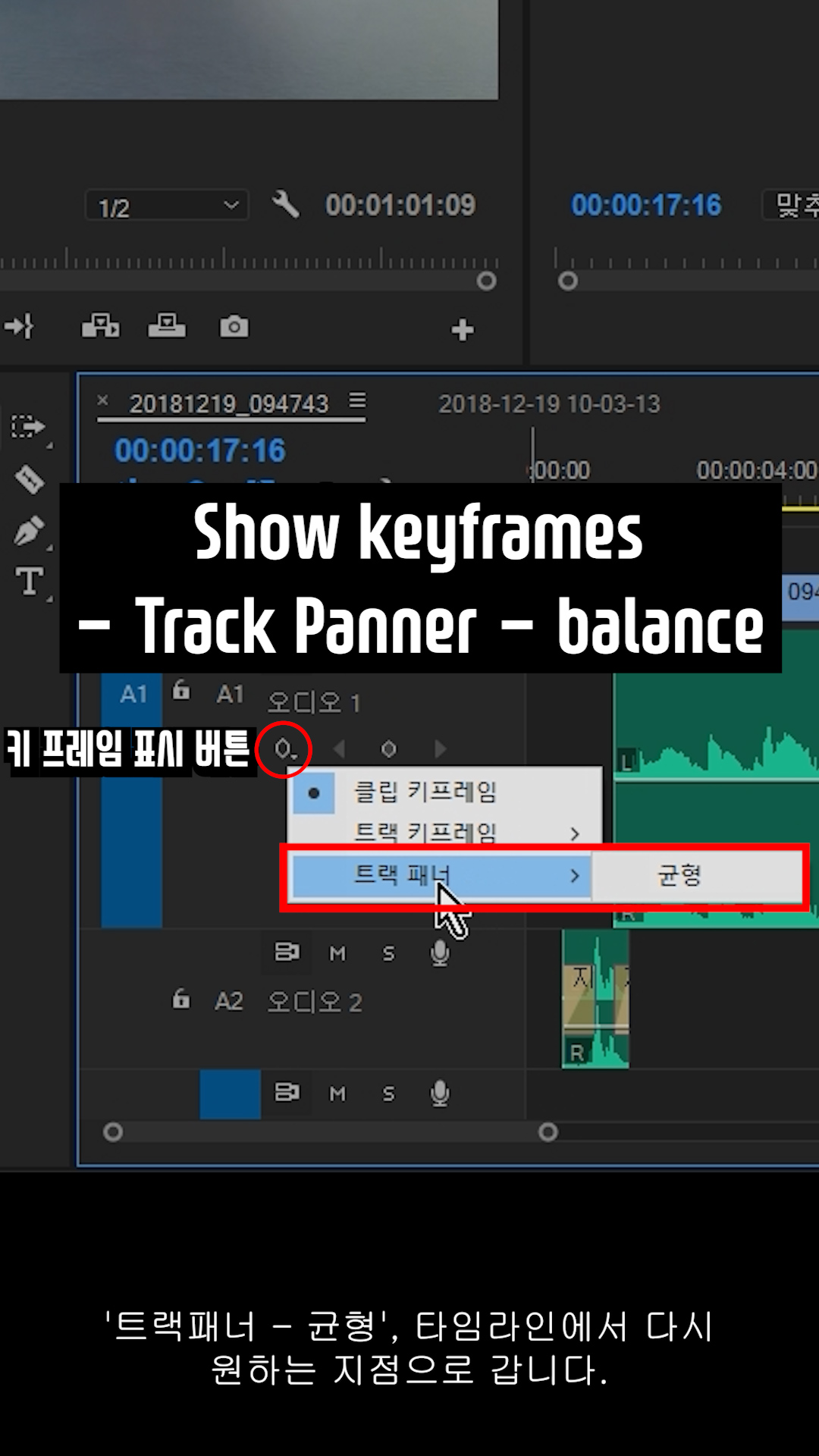 '트랙패너 - 균형'을 선택합니다. 타임라인에서 다시 원하는 지점으로 갑니다.