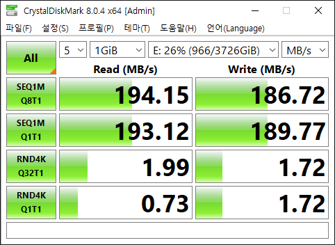 이 하드(TOSHIBA HDD md04aca400n ) 속도를 검색해보니 읽기 쓰기 200mb/s 정도 나오는 거 같아요. 약간의 성능 저하가 있는 거 같아요.
