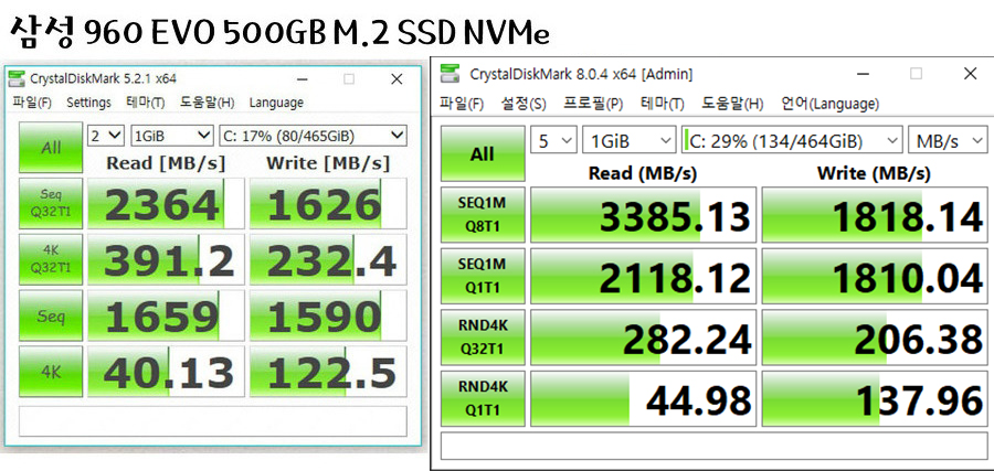 Crystaldiskmerk 속도 측정 기준이 달라져서 정확히 비교는 어렵네요.