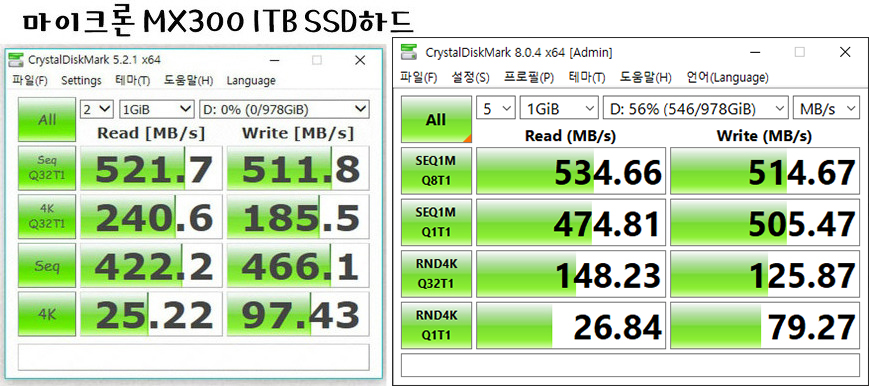 CrystalDiskMark , SSD 속도 측정, 벤치마크 : Micron Crucial MX300 1TB.